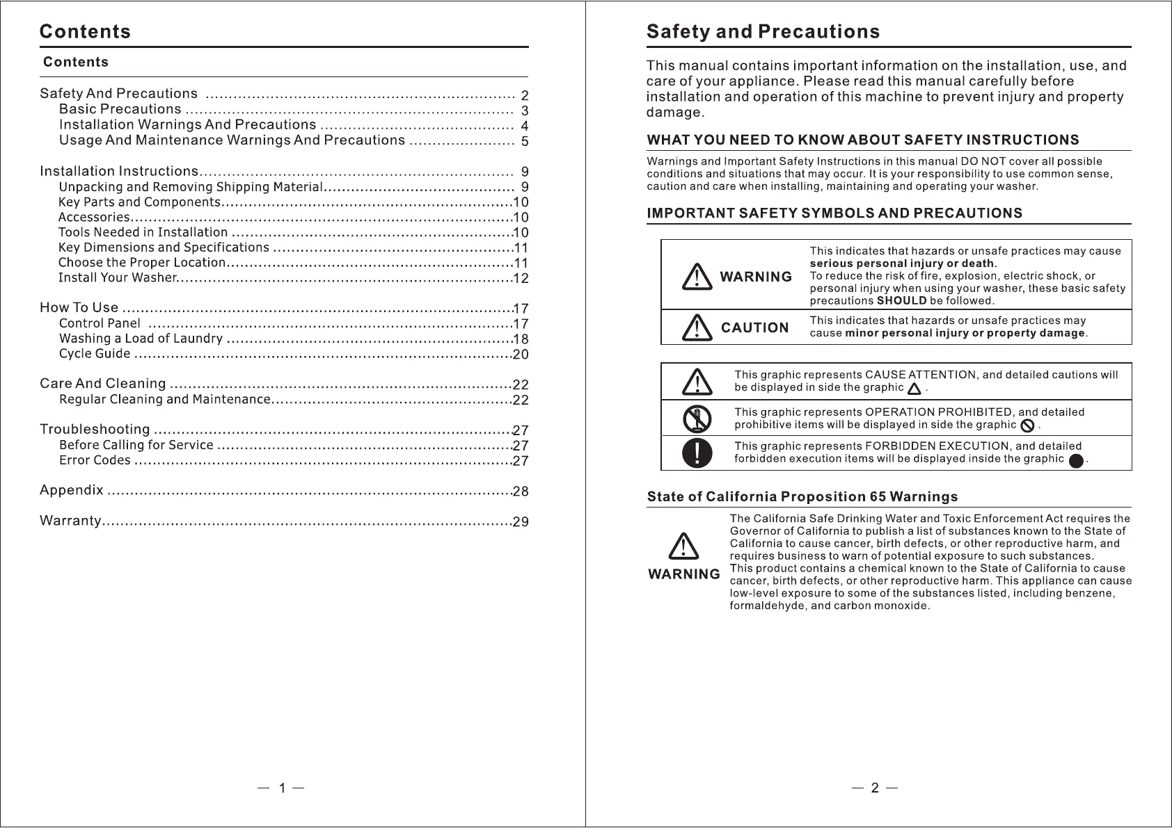 Panda PAN30SW - Contents; Safety and Precautions; Important Safety Symbols and Precautions