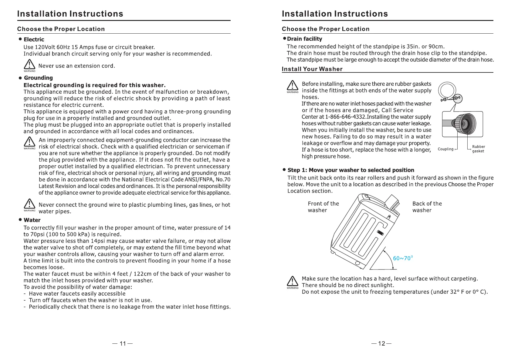 Panda PAN30SW - Electrical Requirements for Installation; Grounding Requirements for Installation; Water Supply Requirements for Installation; Washer Installation Procedure