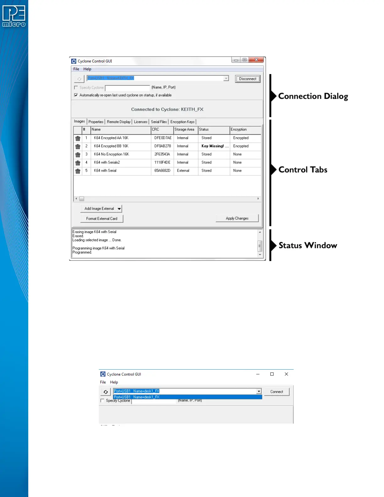 Once the Cyclone is selected, clicking on the “Connect” button will bring a series of tabs that will