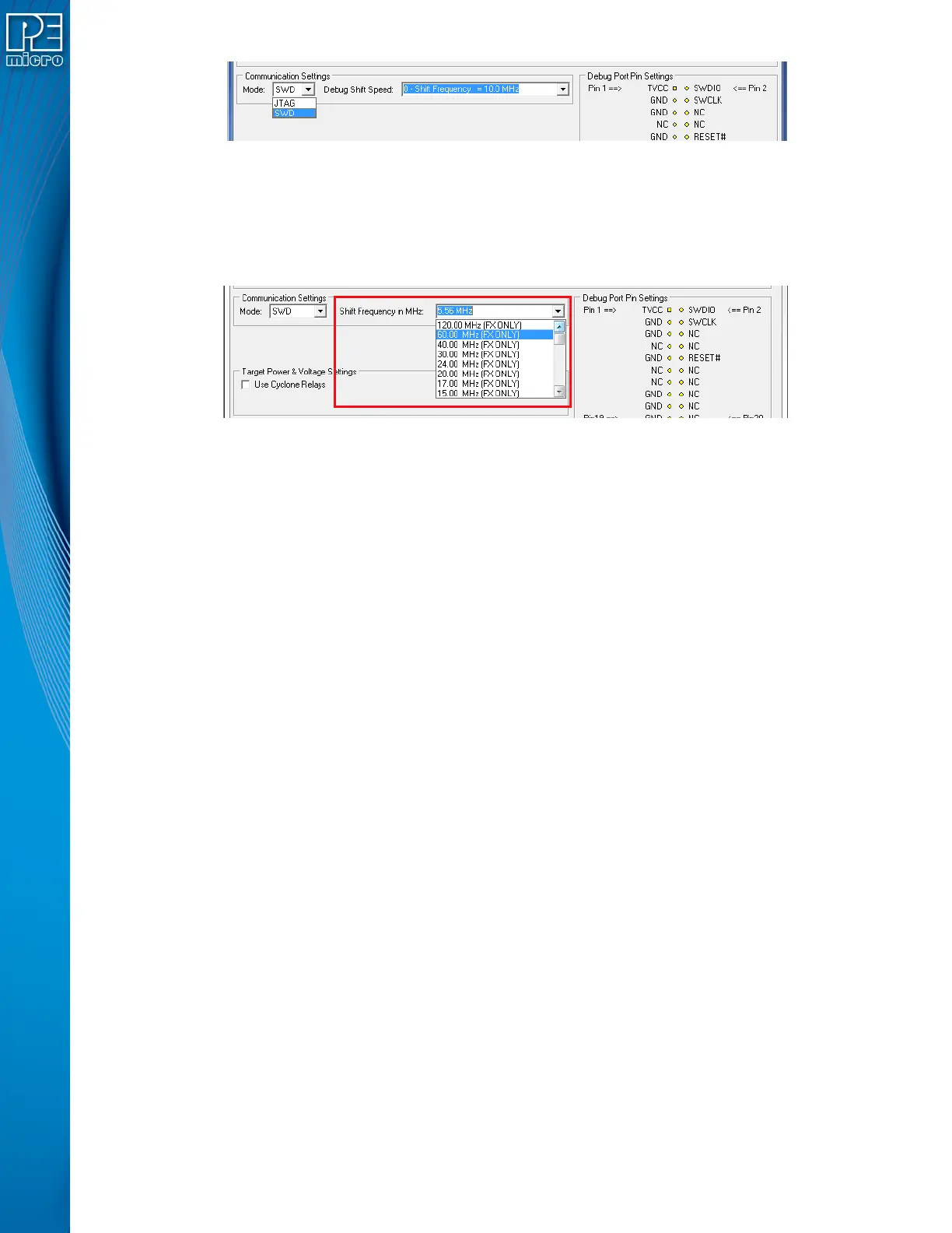 CYCLONE FX programmers also support SWD Mode. This replaces the JTAG connection with a