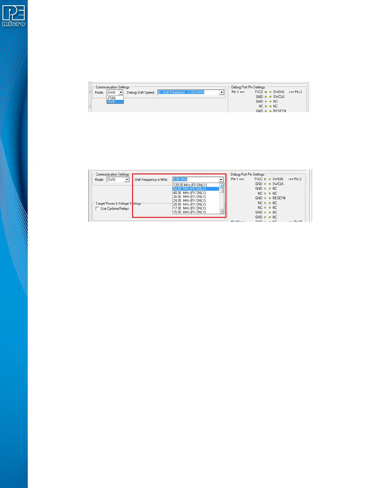 CYCLONE FX programmers also support SWD Mode. This replaces the JTAG connection with a