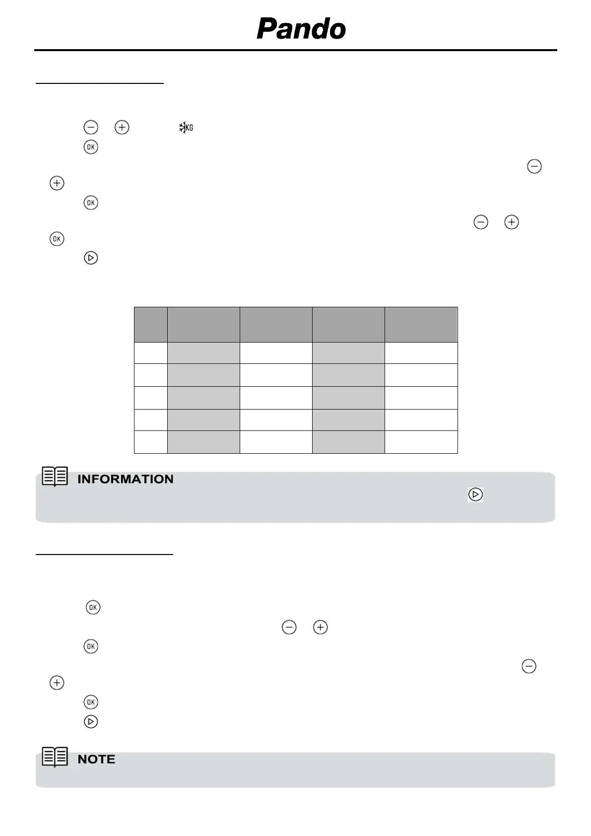 The following table shows the defrosting by weight function programs, indicating weight intervals,