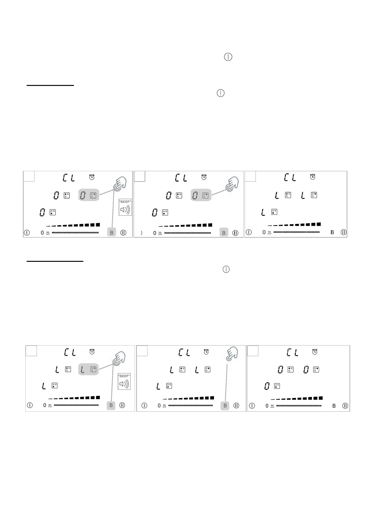 2. Appuyez à la fois sur la touche "B" du bandeau et sur l'indicateur "0" dans la zone de cuisson de droite,