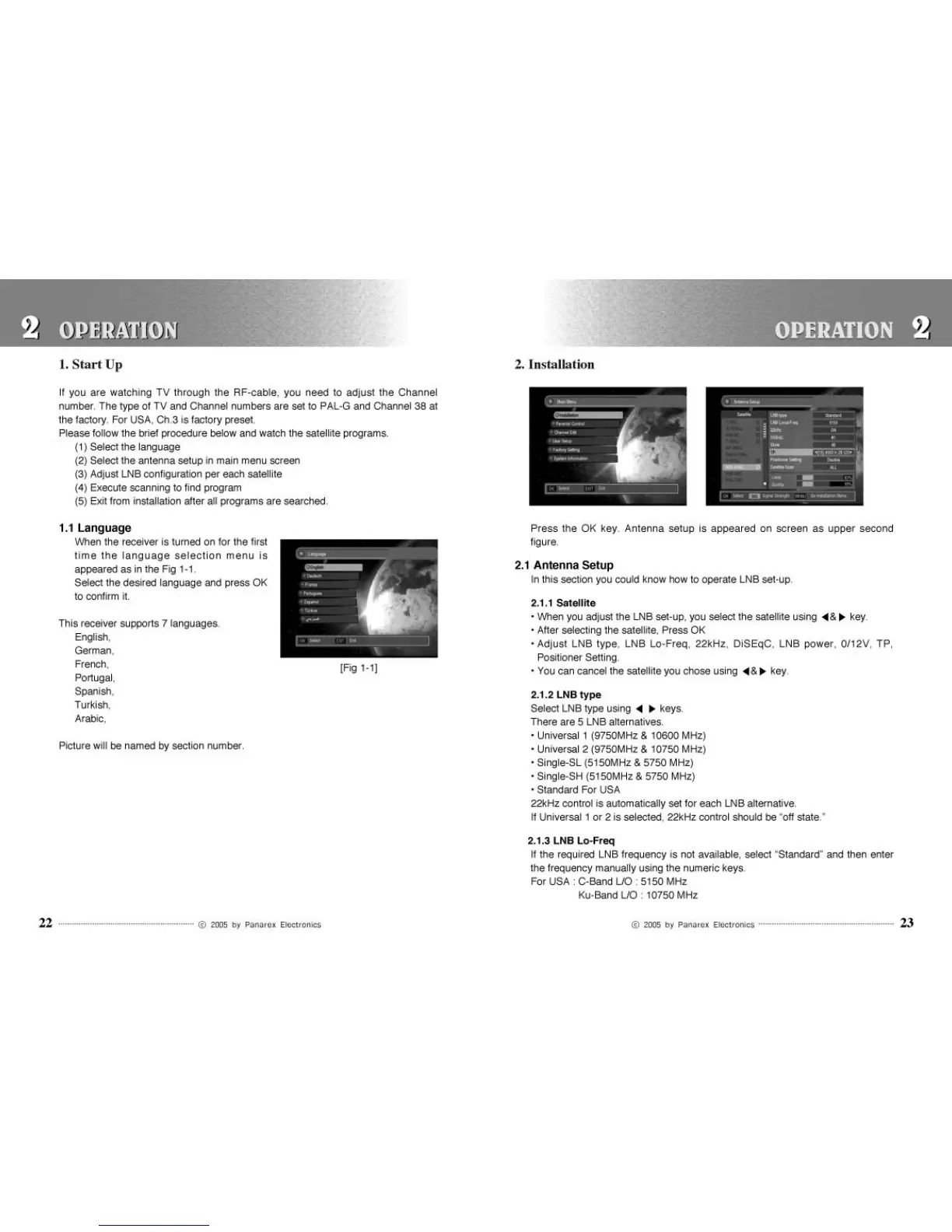 Pansat 2700A - Operation; Start up; Installation; Antenna Setup
