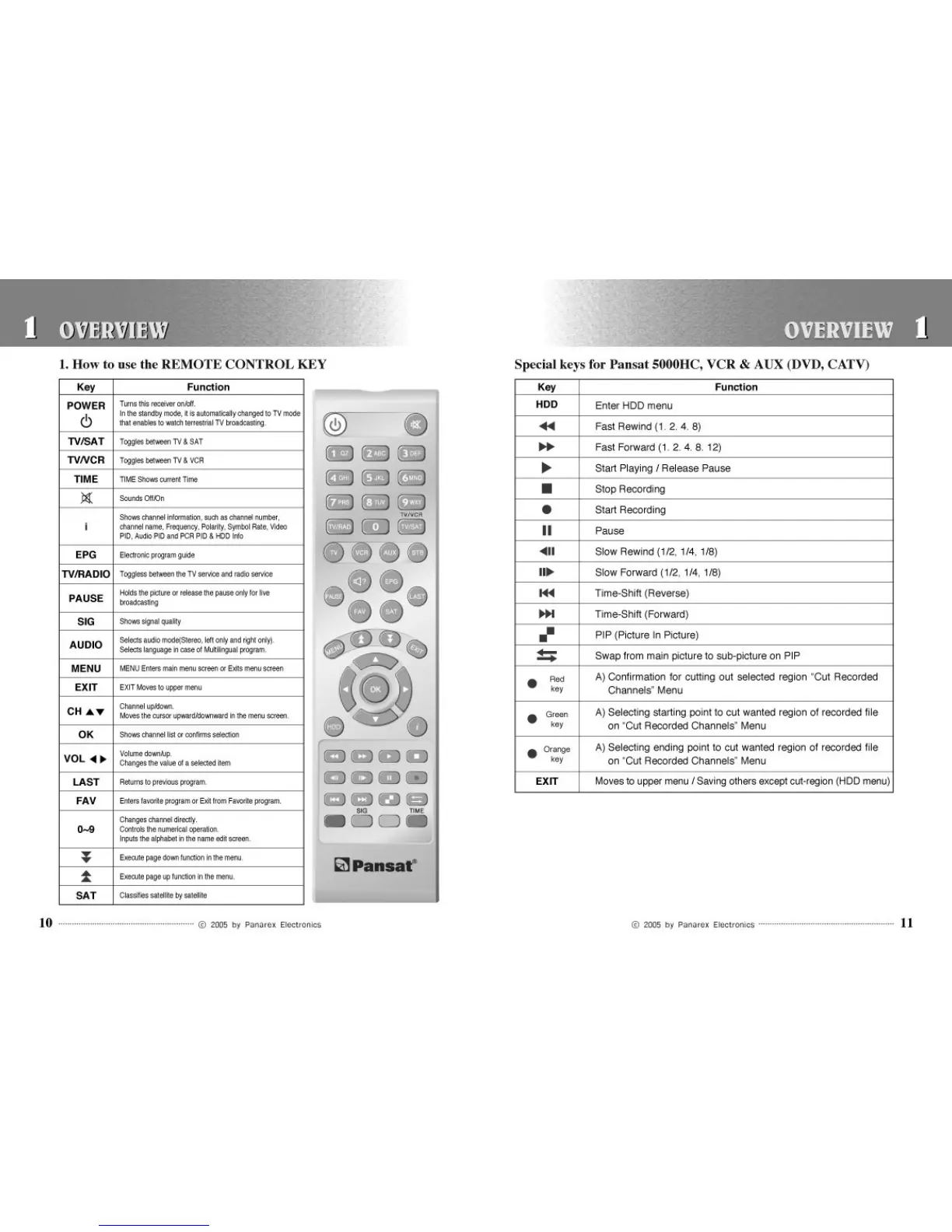 Pansat 2700A - Overview; How to Use the Remote Control Key; Special Keys for Pansat 5000 HC, VCR and AUX (DVD, CATV)