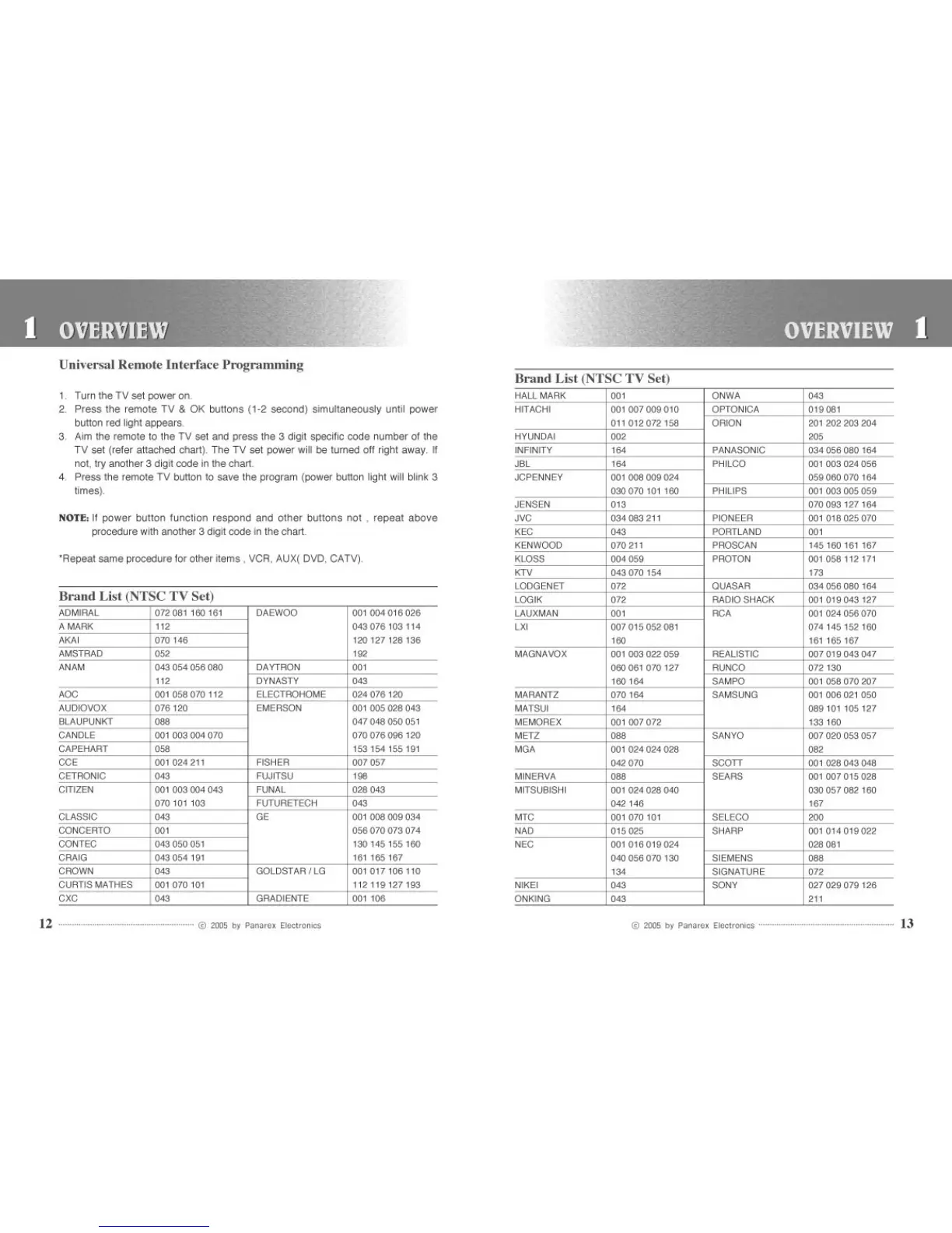Pansat 2700A - Universal Remote Interface Programming; Brand List (NTSC TV Set)
