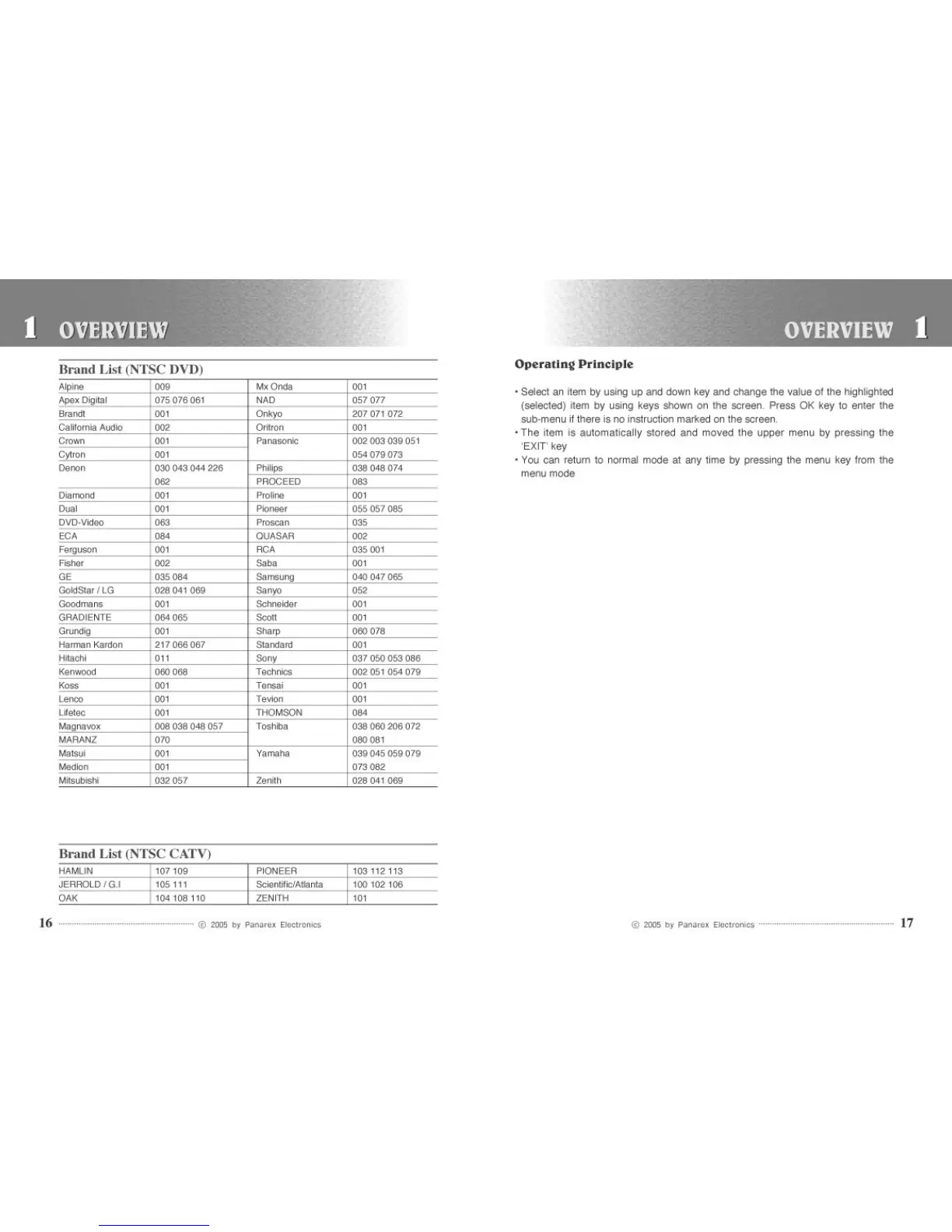 Pansat 2700A - Brand List (NTSC DVD); Brand List (NTSC CATV); Operating Principle