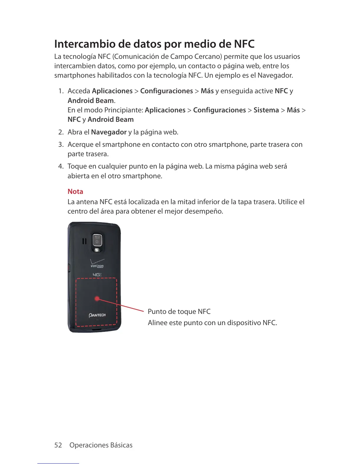 La antena NFC está localizada en la mitad inferior de la tapa trasera. Utilice el