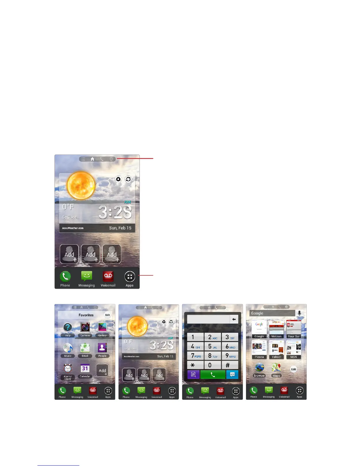 features. It displays shortcuts for favorite contacts and apps, and thumbnails