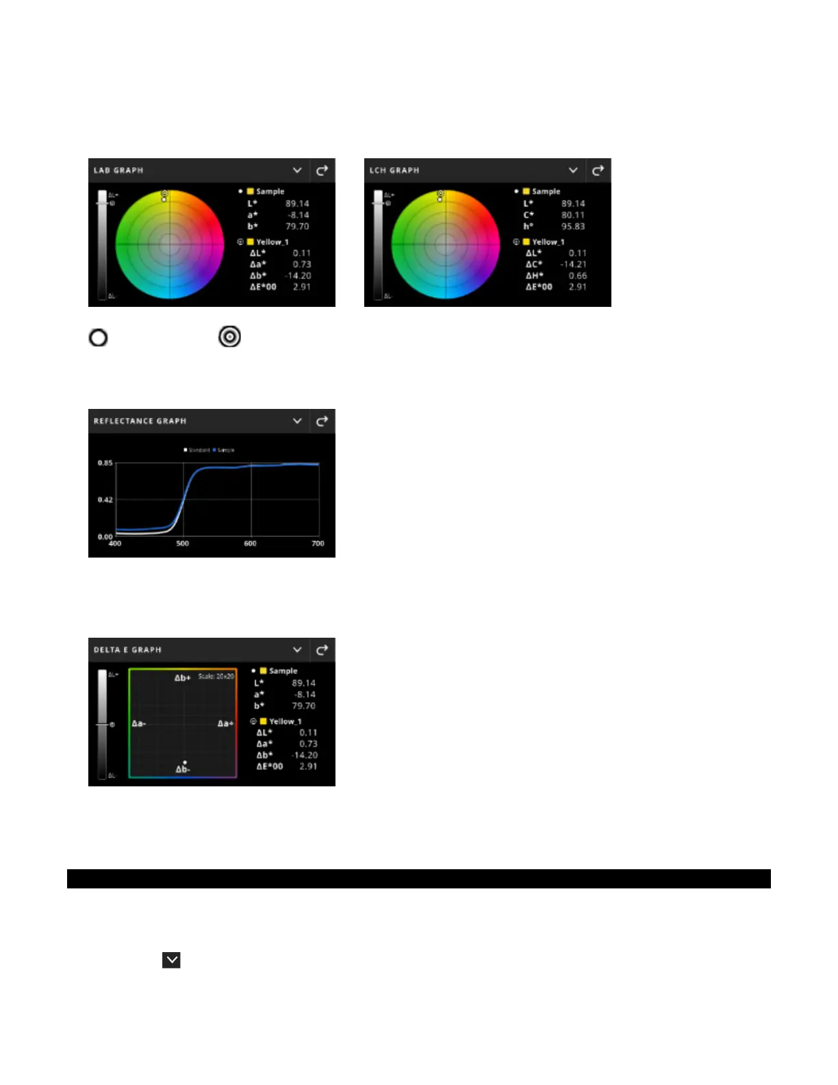 These two graphs visualize the measurement values on a color wheel and brightness bar graph. The sample