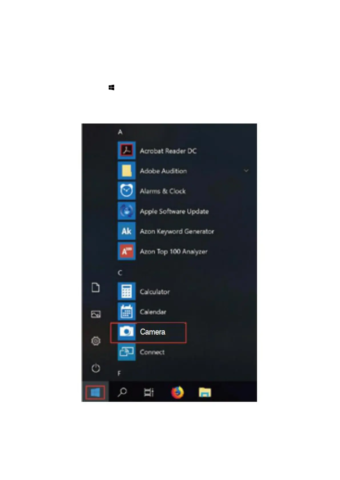 b) Válassza a Start gombot, majd az alkalmazások listájában válassza a „Kamera”