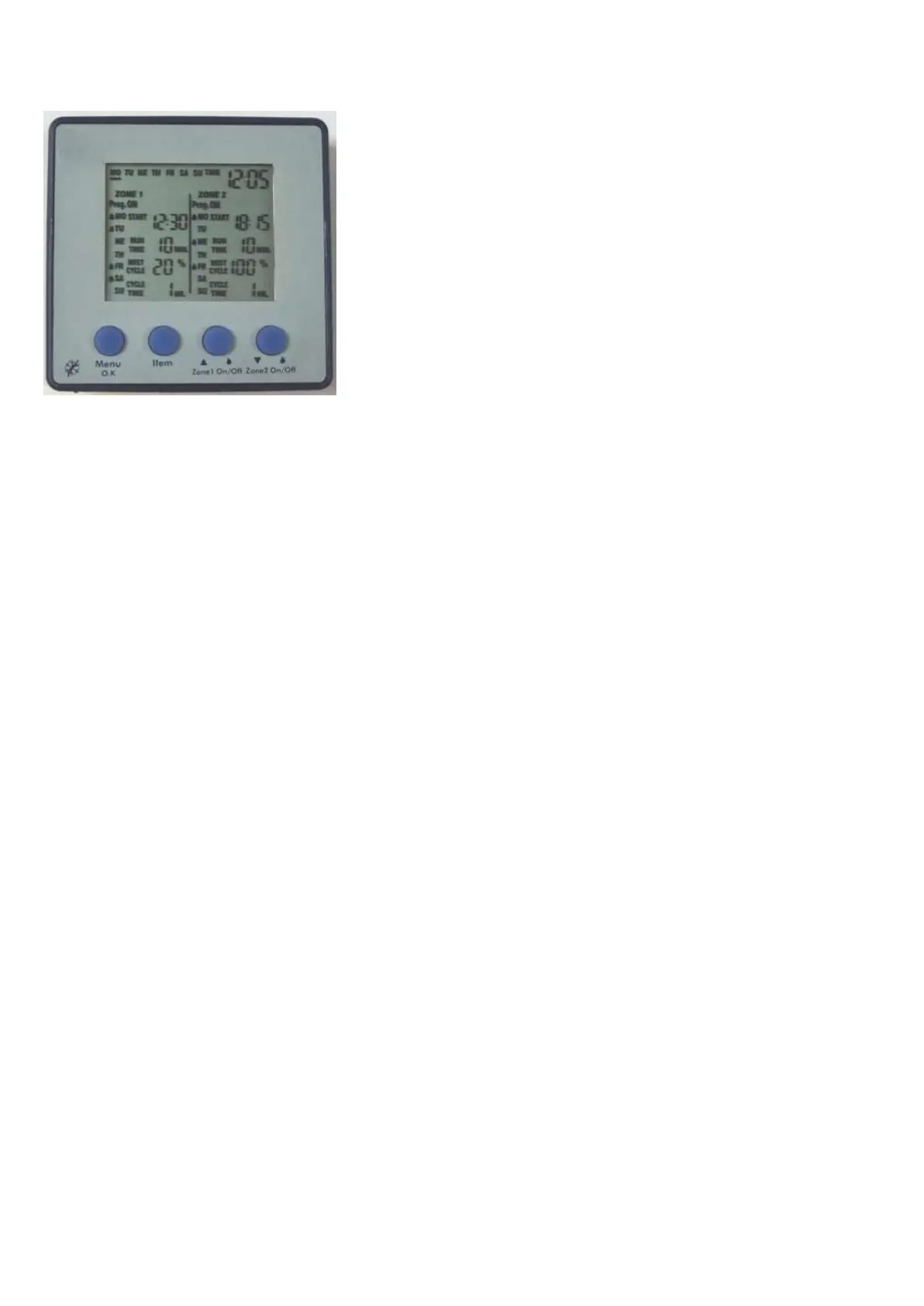 1 or Zone 2 button to select the current day of week and press button Item to save your selection.