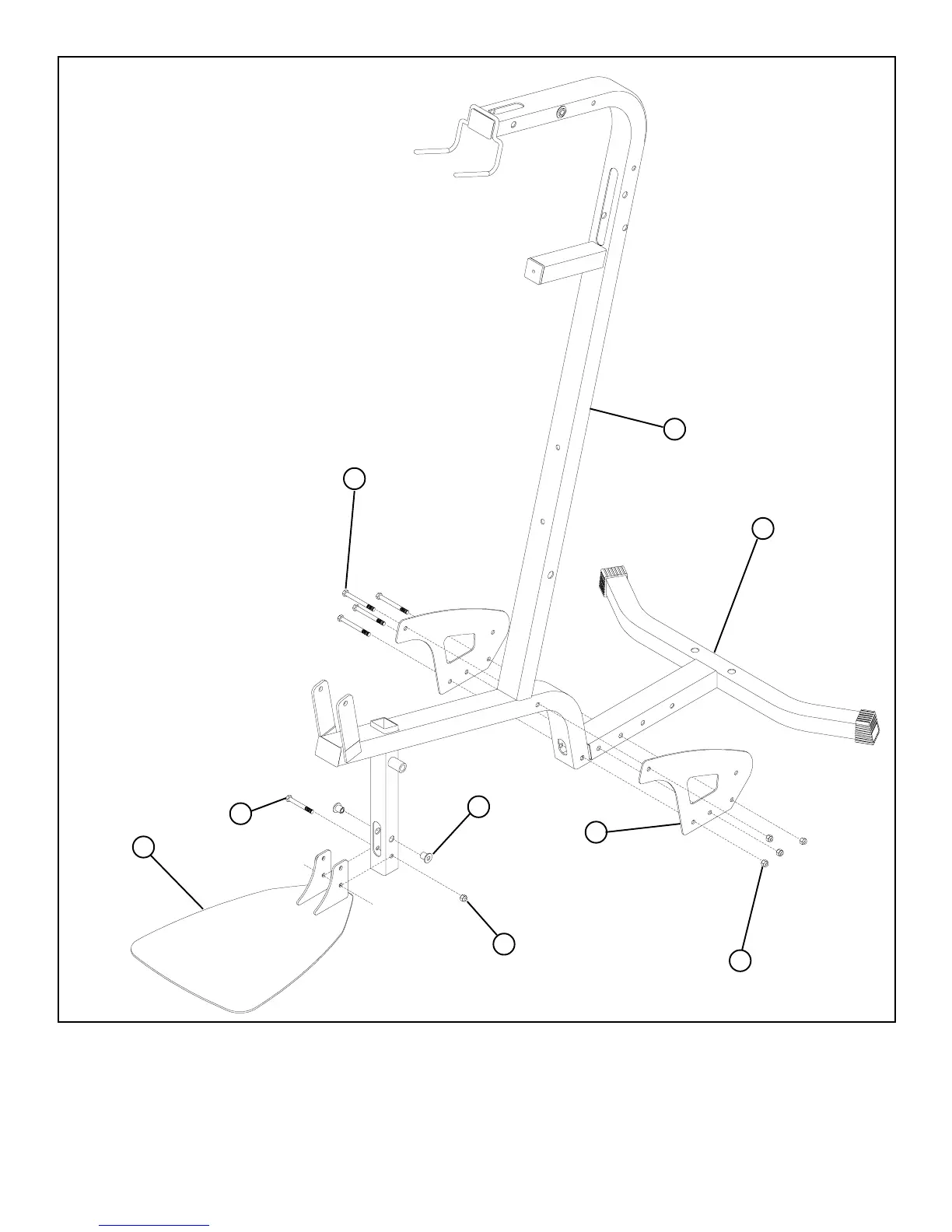 LOOSELY assemble the FOOTPLATE (62) to the lower holes in the FRAME (1) using one 3/8 x 3” BOLT (29) and one