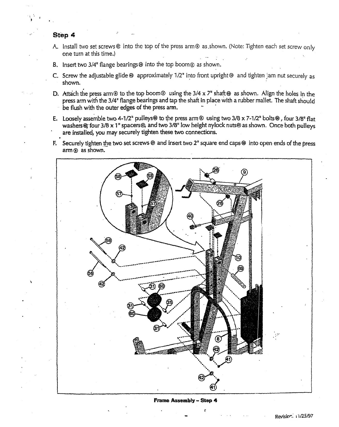 Attach tt~e press arm@ to the top boom@ using the 3/4 x 7" shaft@ as shown. Align the holes in l:he
