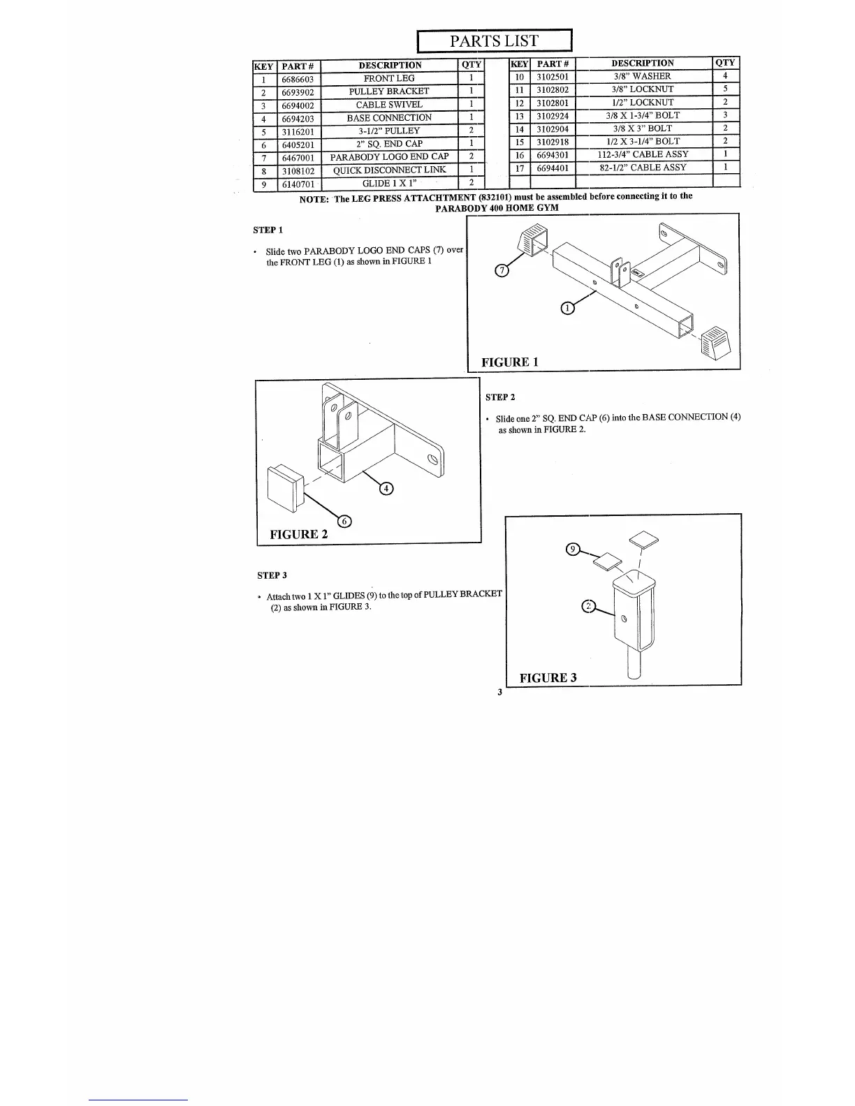ParaBody 415101 - Parts List and Initial Steps; Step 1: Prepare Front Leg; Step 2: Attach Base Connection; Step 3: Prepare Pulley Bracket