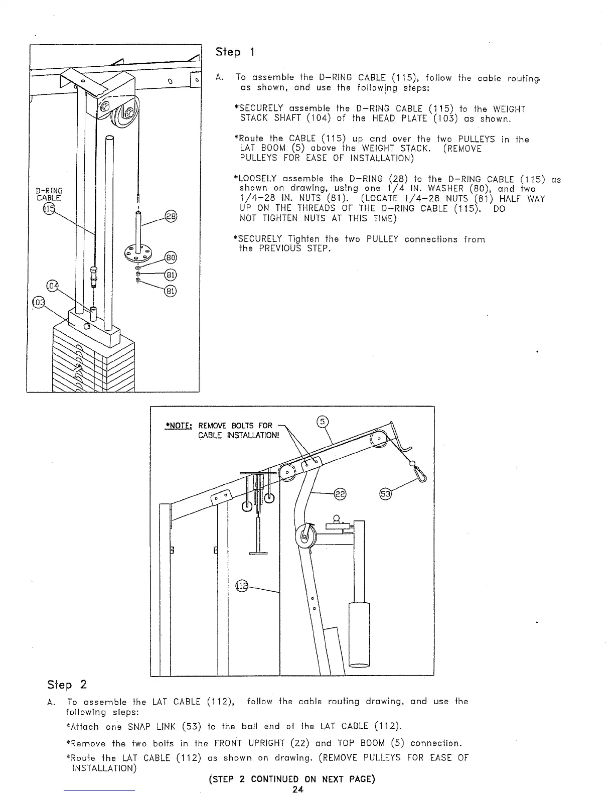 *SECURELY assemble the D-RING CABLE (115) to the WEIGHT