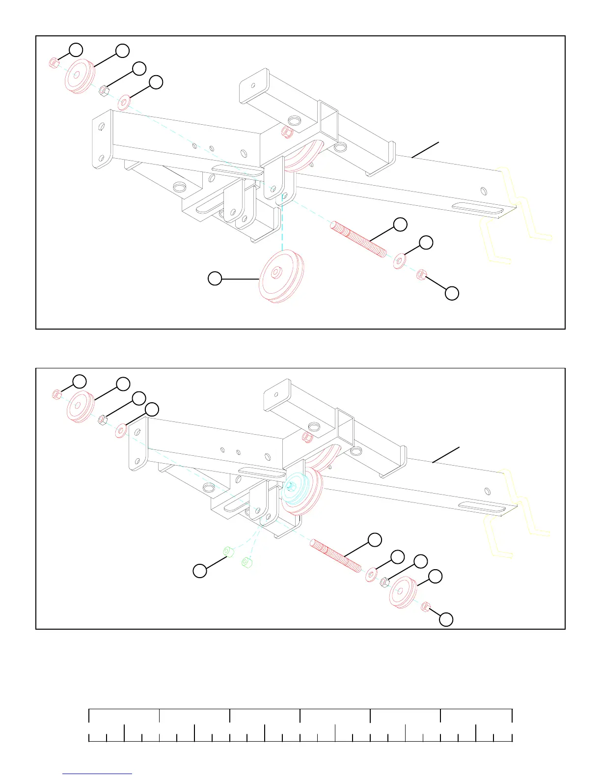 • SECURELY assemble two 2” PULLEYS (69) to the rear bracket on the TOP BOOM using the 3/8” THREADED SHAFT (106), two 3/8”