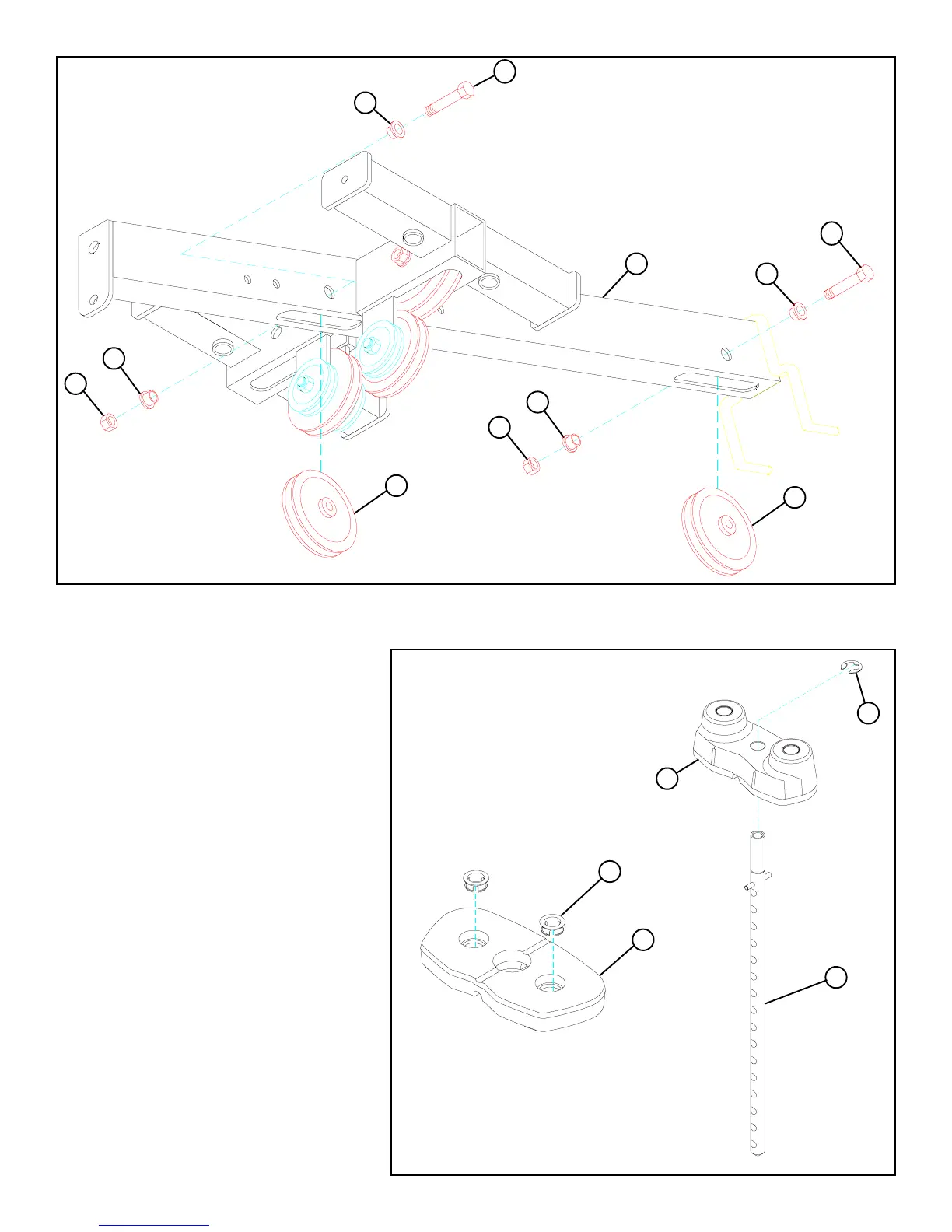 • LOOSELY assemble two 3-1/2” PULLEYS (42) to the TOP BOOM (17) using two 3/8 X 2-3/4” BOLTS (85), four 3/8” FLANGE SPACERS
