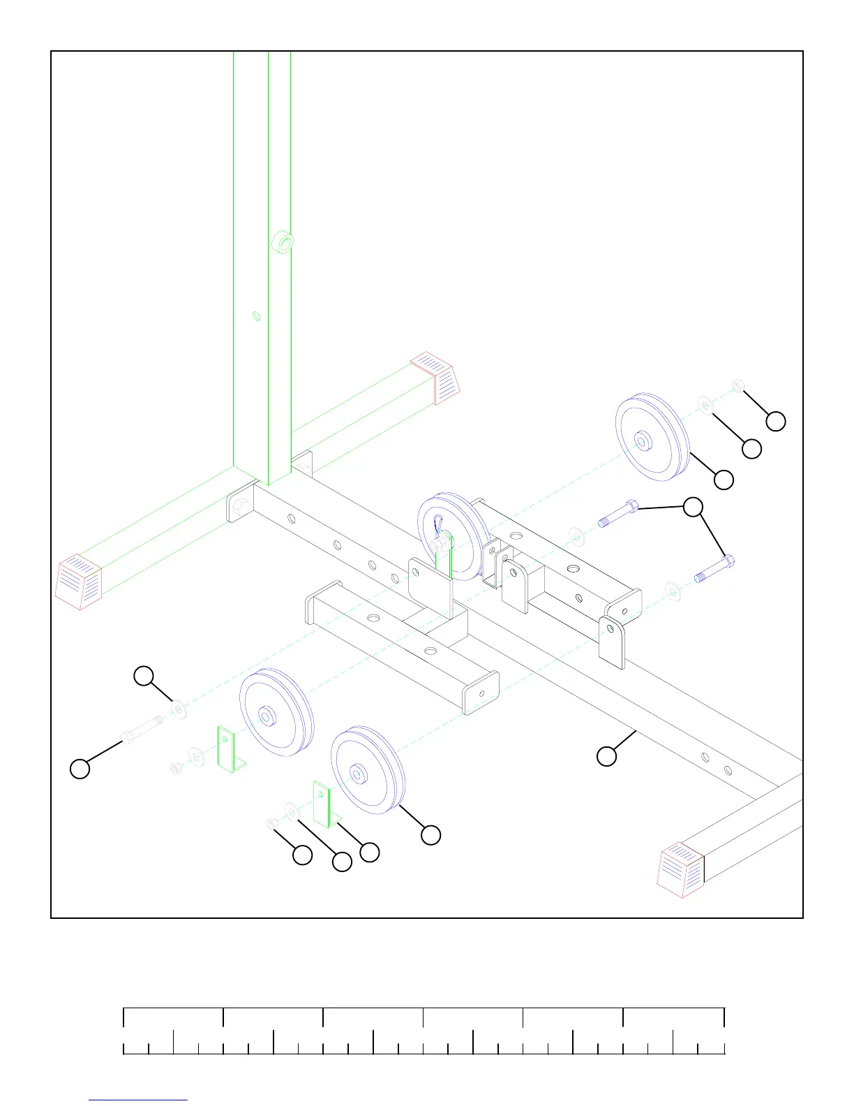 SECURELY assemble three 4-1/2” PULLEYS (43) to the flats on the BASE (1) using three 3/8 X 2” BOLTS (84), six 3/8” WASHERS (91),
