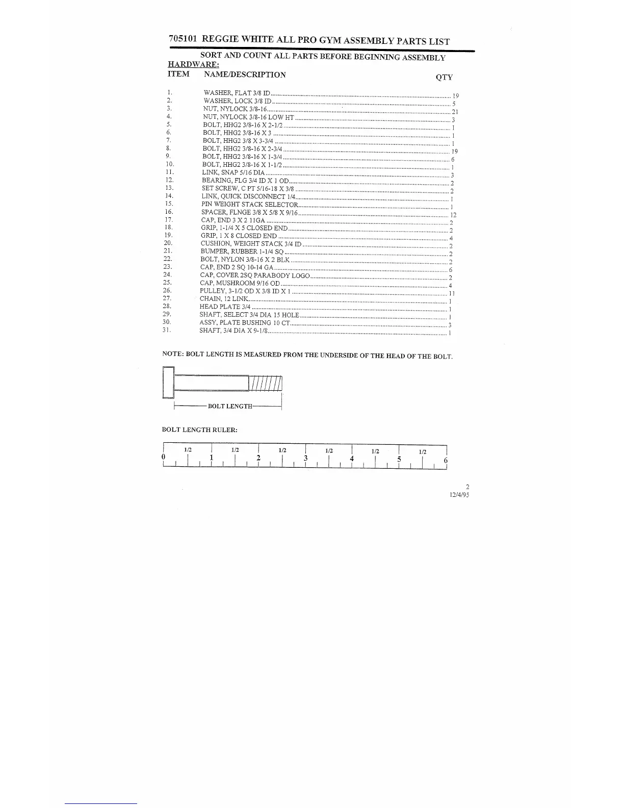 REGGIE WHITE ALL PRO GYM ASSEMBLY PARTS LIST