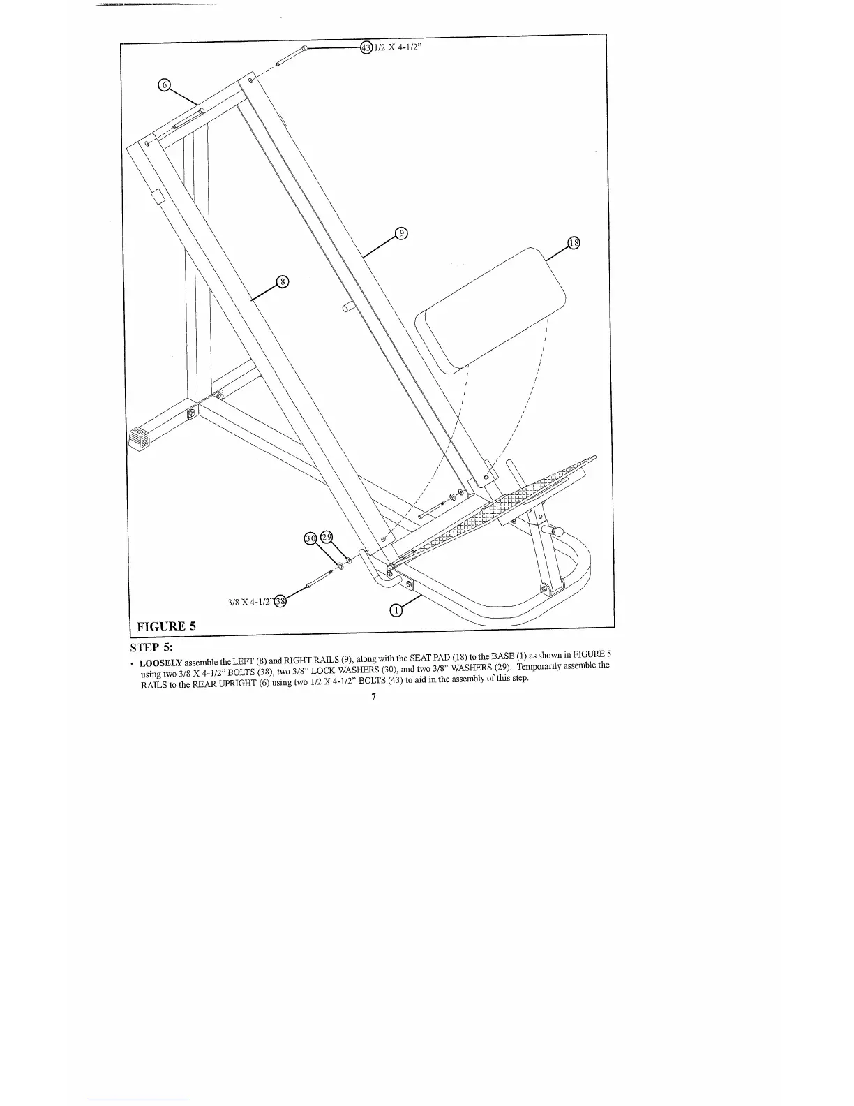 RAILS to the REAR UPRIGHT (6) using two 1/2 X 4-1/2" BOLTS (43) to aid in the assembly of this step.