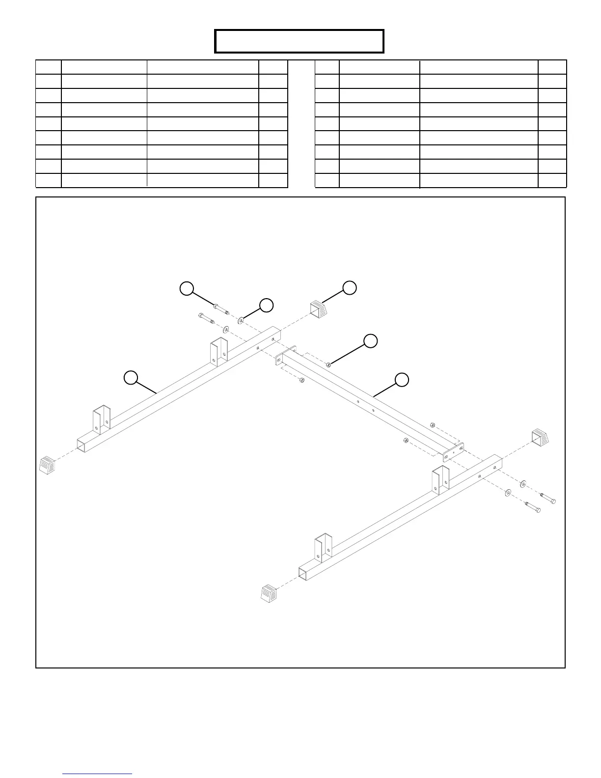 LOOSELY assemble the LOWER CONNECTOR (6) between each UPRIGHT BASE (2) using four 1/2 X 3” BOLTS (8), four 1/2”