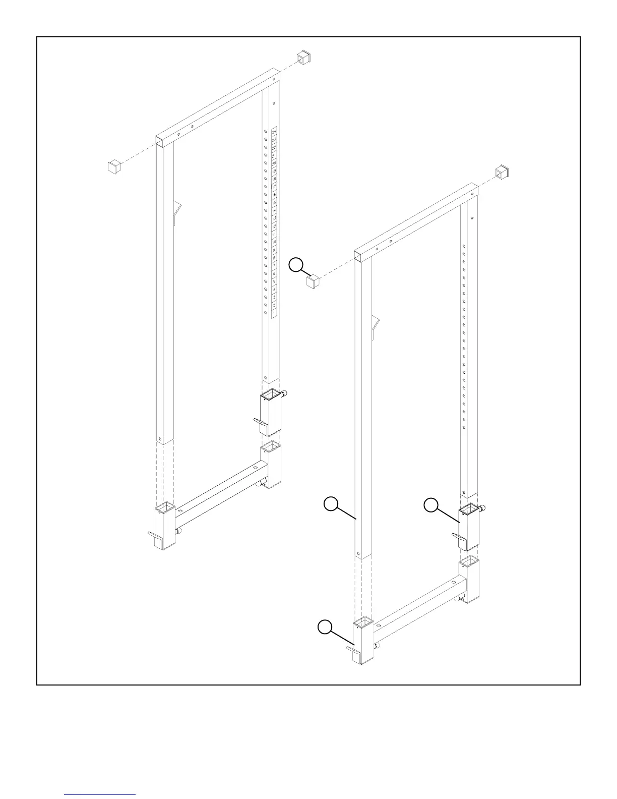 • Slide one BAR SUPPORT (4) and one SAFETY RAIL (3) (IN THAT ORDER) onto each UPRIGHT (1). Pull back on the