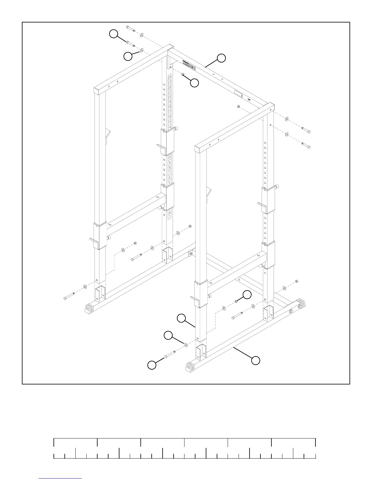 • LOOSELY assemble each UPRIGHT (1) to the UPRIGHT BASE (2) using four 1/2 X 4” BOLTS (9), eight 1/2” WASHERS (10),