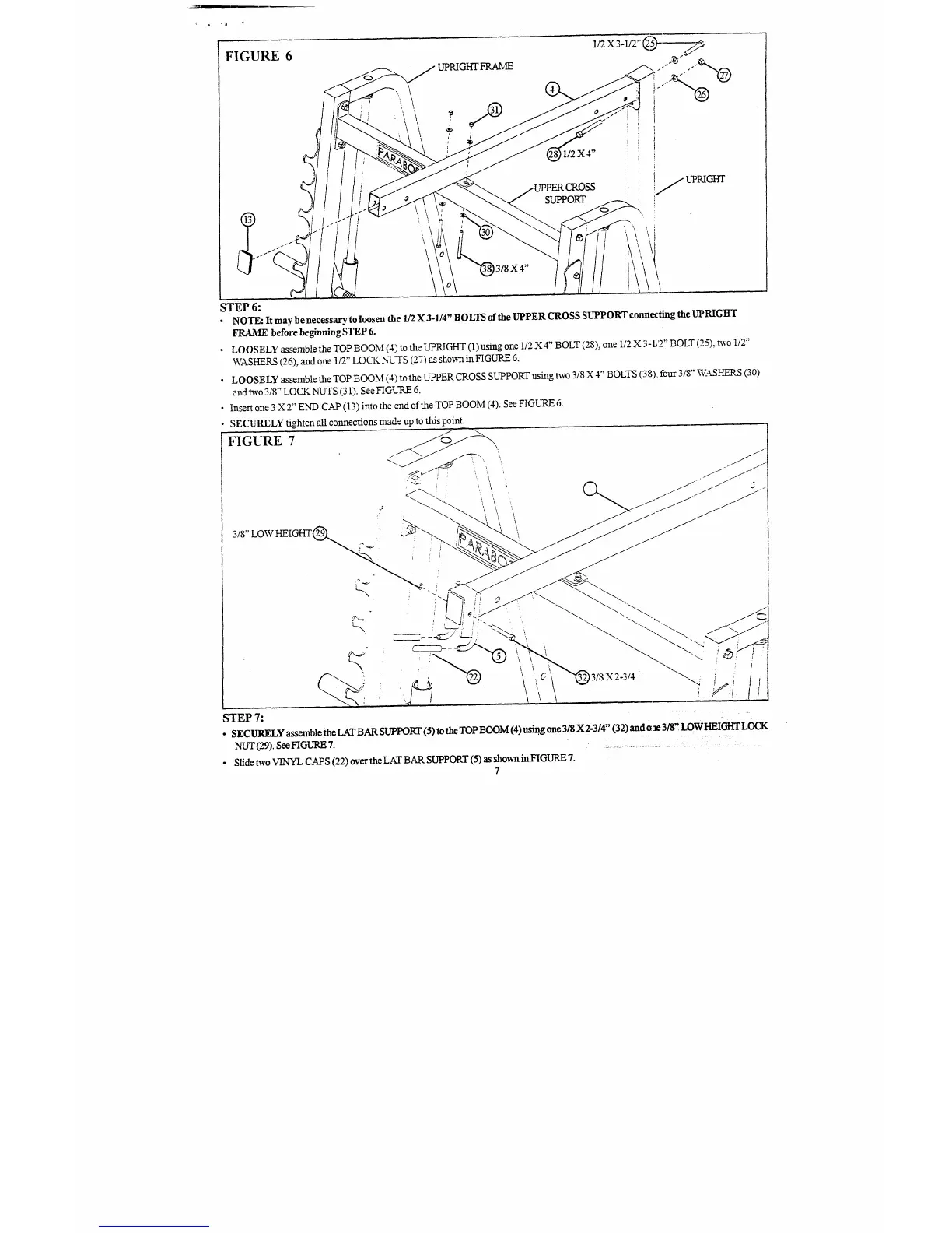¯ LOOSELY assemble the TOP BOOM (4) to the UPPER CROSS SUPPORT using t~vo 3/8 X 4" BOLTS (38).~ four 3/8"’ WASHERS