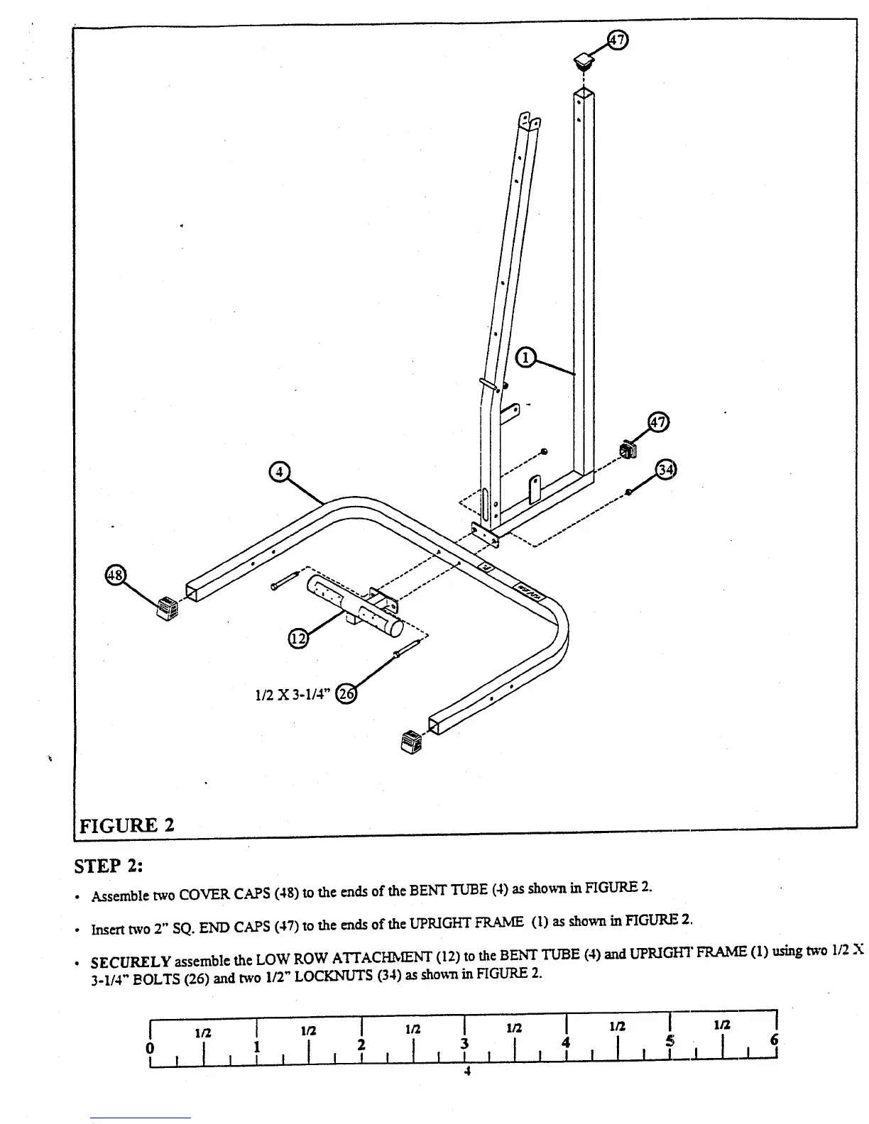 SECURELY assemble the LOW ROW ATTACHmeNT (12) to the BENT TLTBE (4) and UPRIGHT FRAME (1) using two