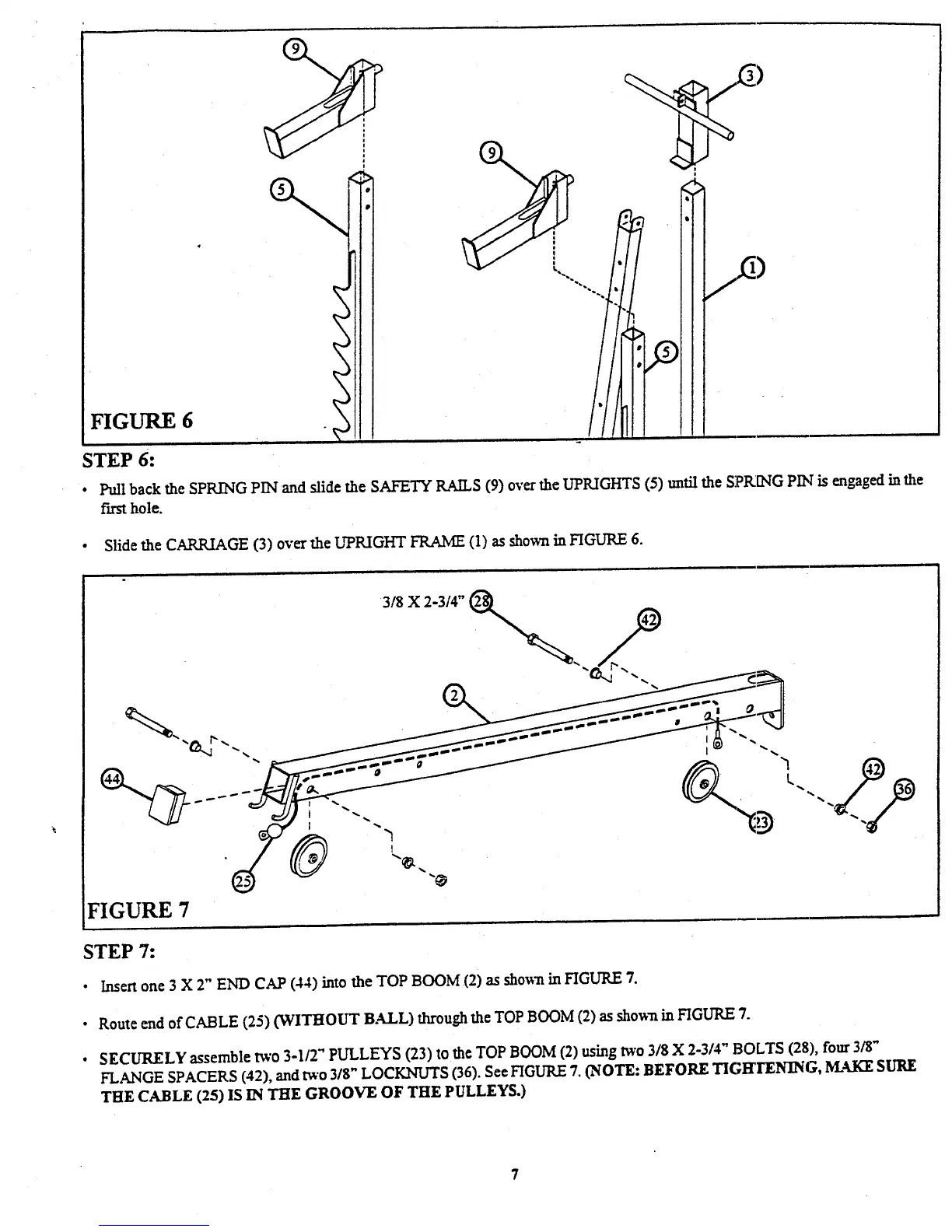 ¯ SECURELY assemble two 3-1/2" PULLEYS (23) to the TOP BOOM (2) using r¢,-o 3/8 X 2-3/4" BOLTS (28), four