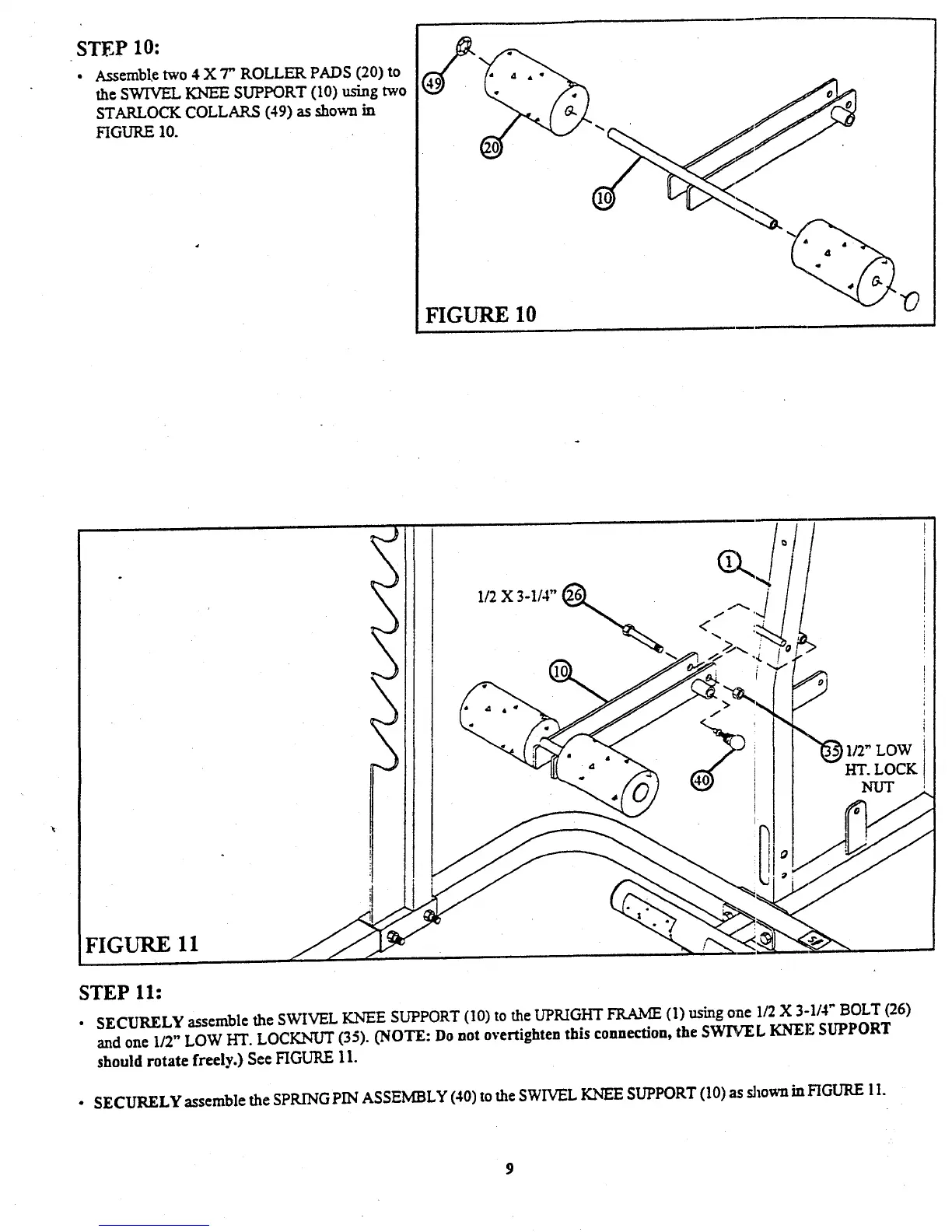 SECURELY assemble the SWIVEL KNEE SUPPORT (10) to the UPRIGHT FRAME (1) using one 1/2 X 3-1/4" BOLT