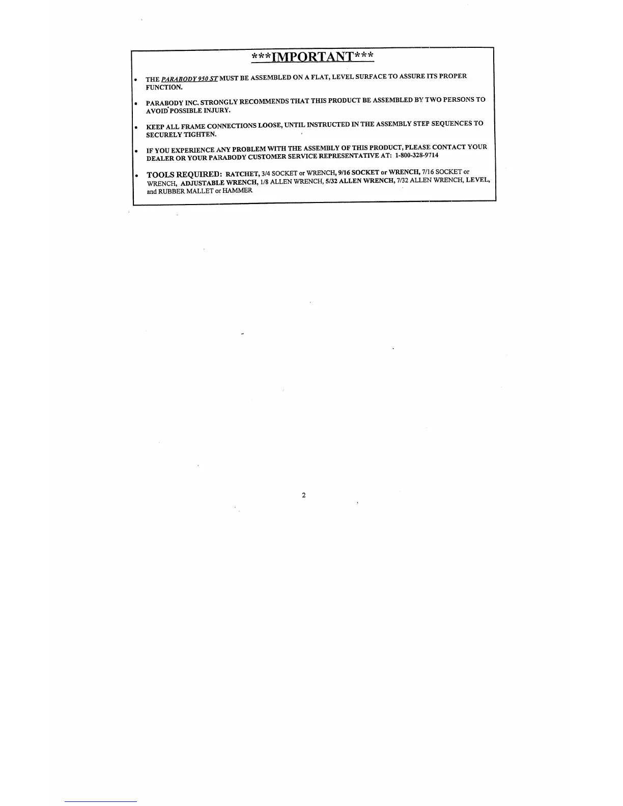 THE pARABODY 950 ST MUST BE ASSEMBLED ON A FLAT, LEVEL SURFACE TO ASSURE ITS PROPER