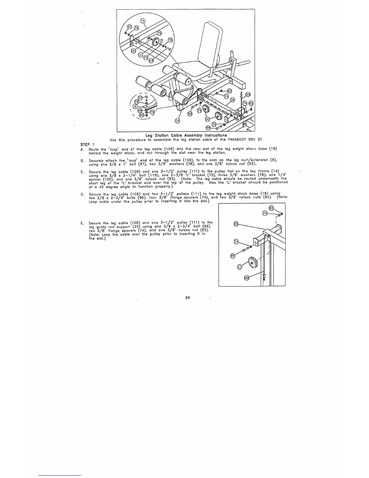 Secure the leg cable (108~ and one 3-1/2’ pulley (111) fo