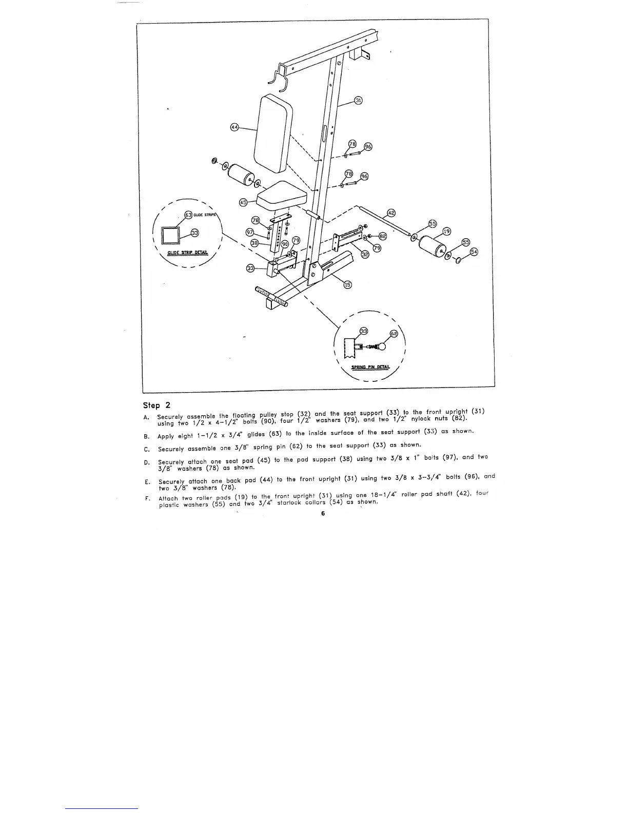 Securely assemble the floating pulley stop (:52), and the s.eat support (33) to the front upright