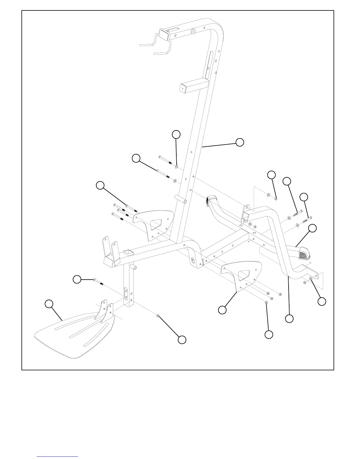 • LOOSELY assemble the FOOTPLATE (62) to the lower holes in the FRAME (1) using one 3/8 x 3” BOLT (29) and one