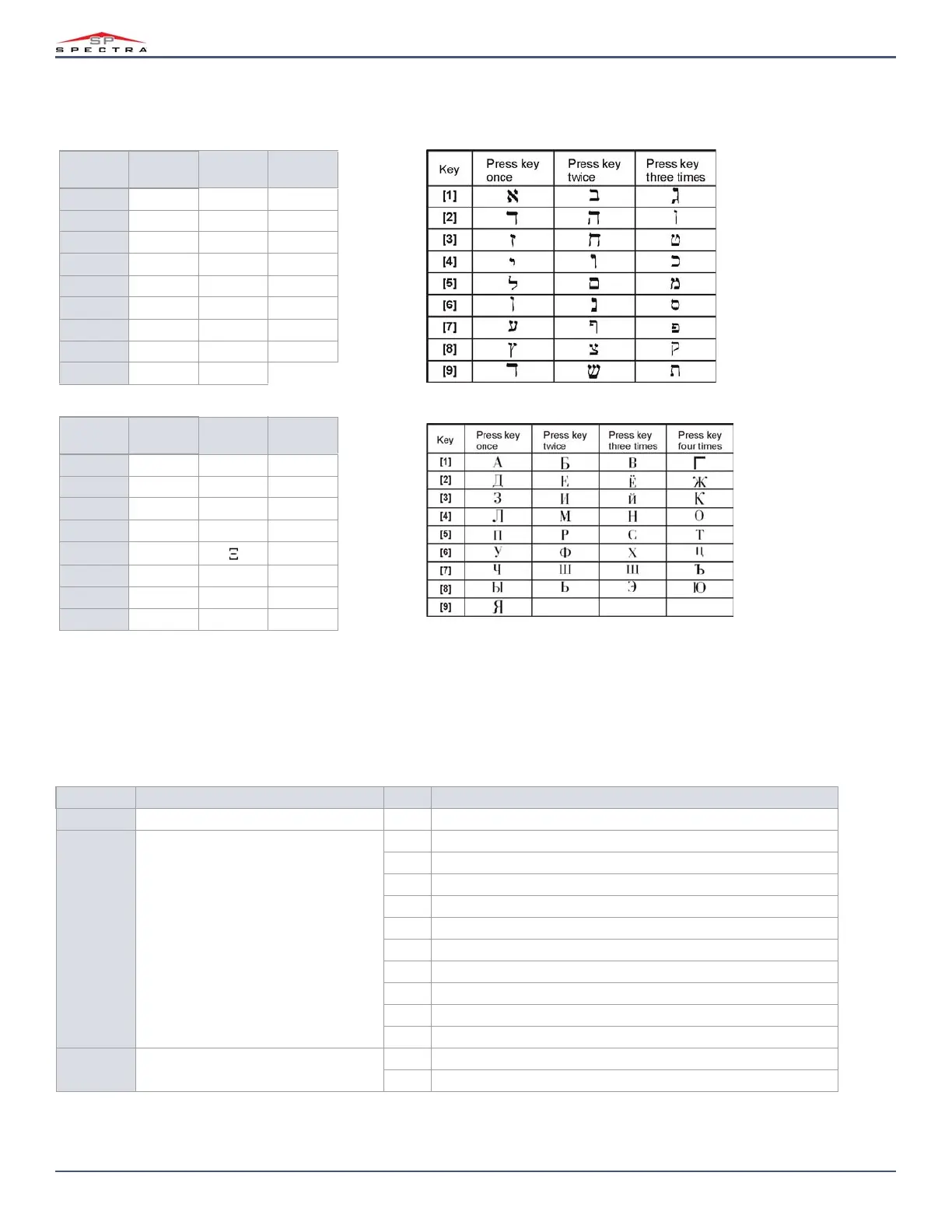 The following section outlines the different configurations for keypad letter assignments, including those in Hebrew, Greek, and Russian.