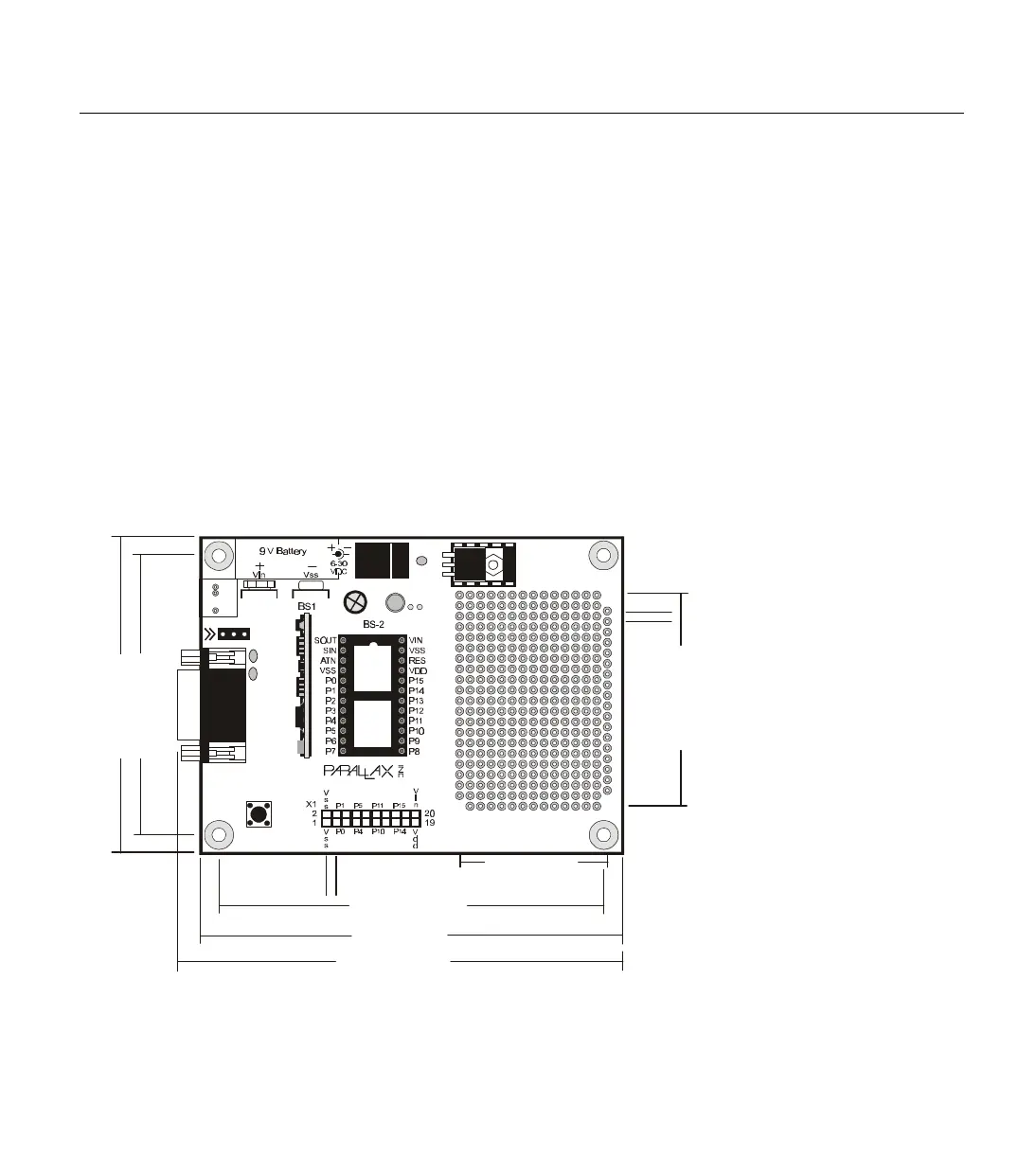 (Stamp 2, 2e, 2sx), reset button, 9-volt battery clips, barrel connector,