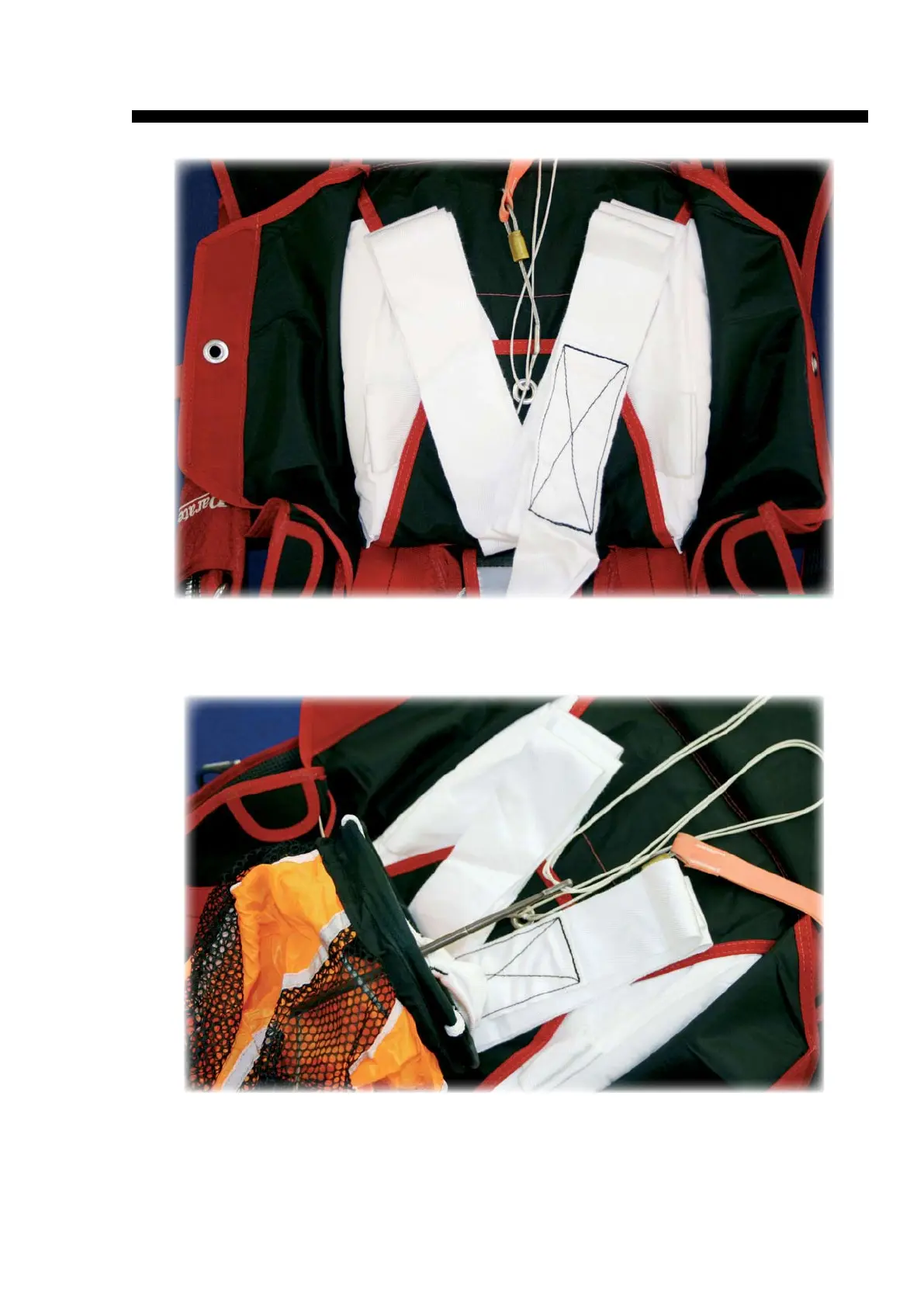 Place the bottom rim of the spring pilot chute on the base of the V, to