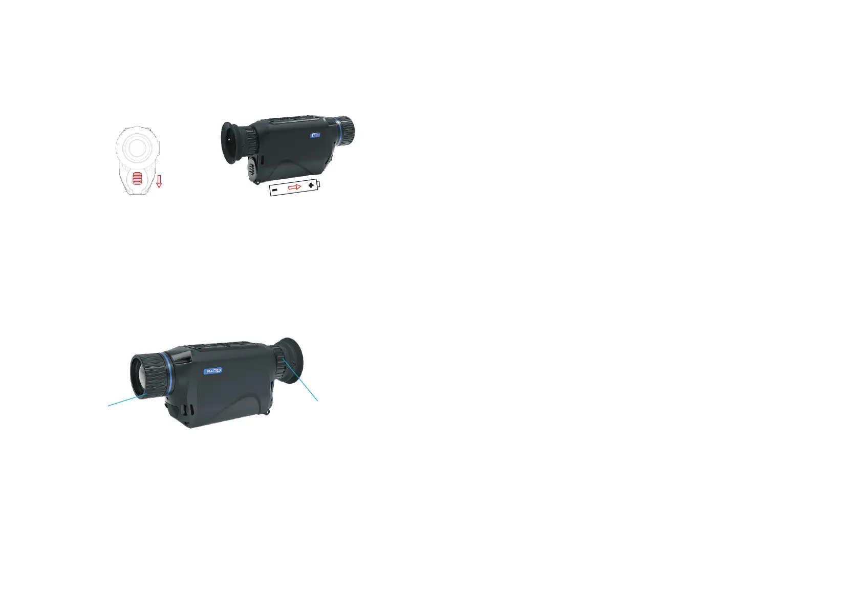electrode towards the front objective lens. Put on the battery compartment cover