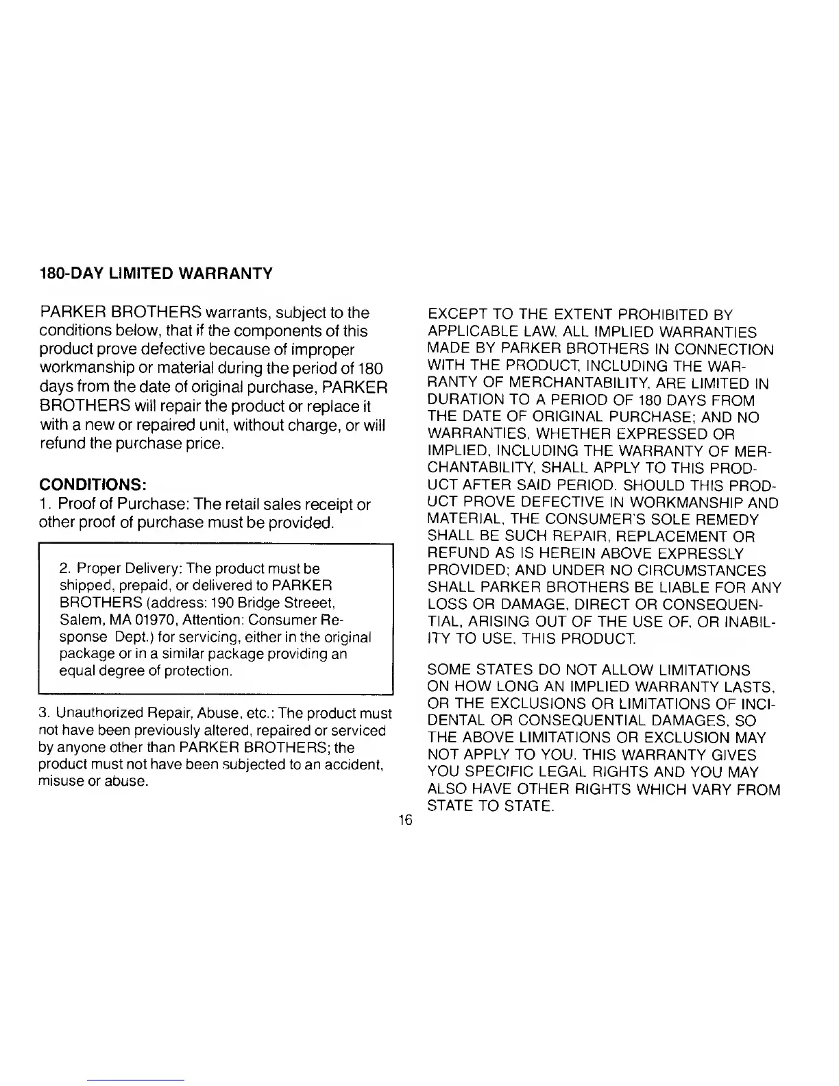Parker Brothers split second - Warranty Information; Warranty Conditions and Service; Warranty Limitations and Exclusions