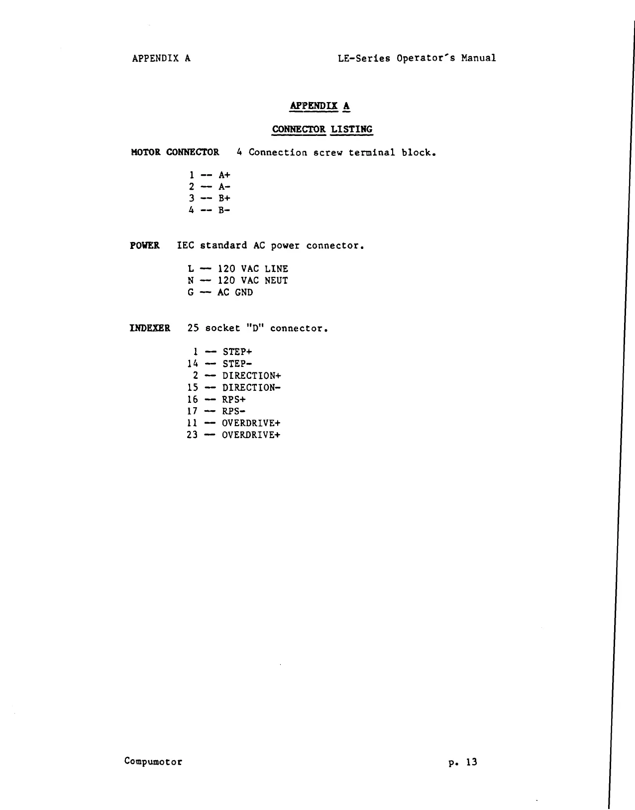 Parker Compumotor - Appendix A: Connector Listing