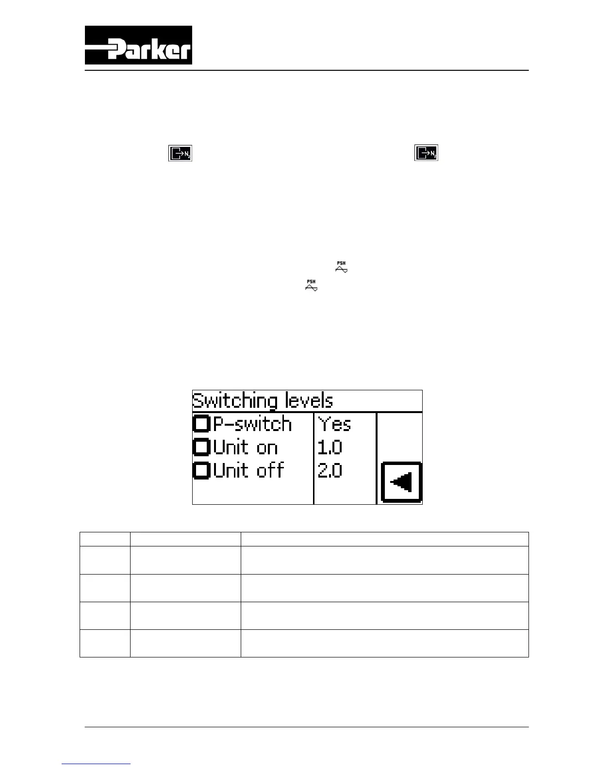 In the pressure switch menu you can set the levels of the outlet pressure at which