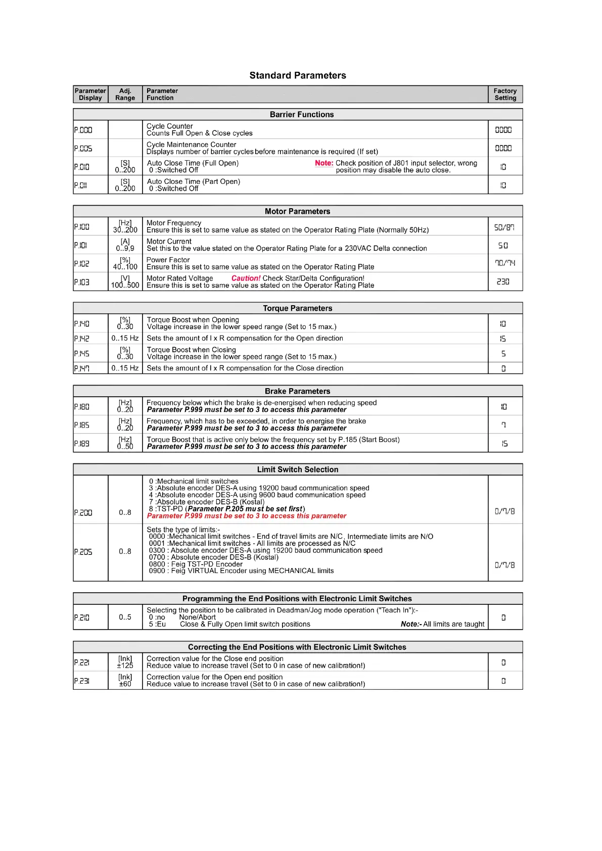 Parking Facilities PF6000 - Standard Parameters - Barrier and Motor Settings; Barrier Function Parameter Configuration; Motor Parameter Configuration; Torque and Brake Parameter Configuration