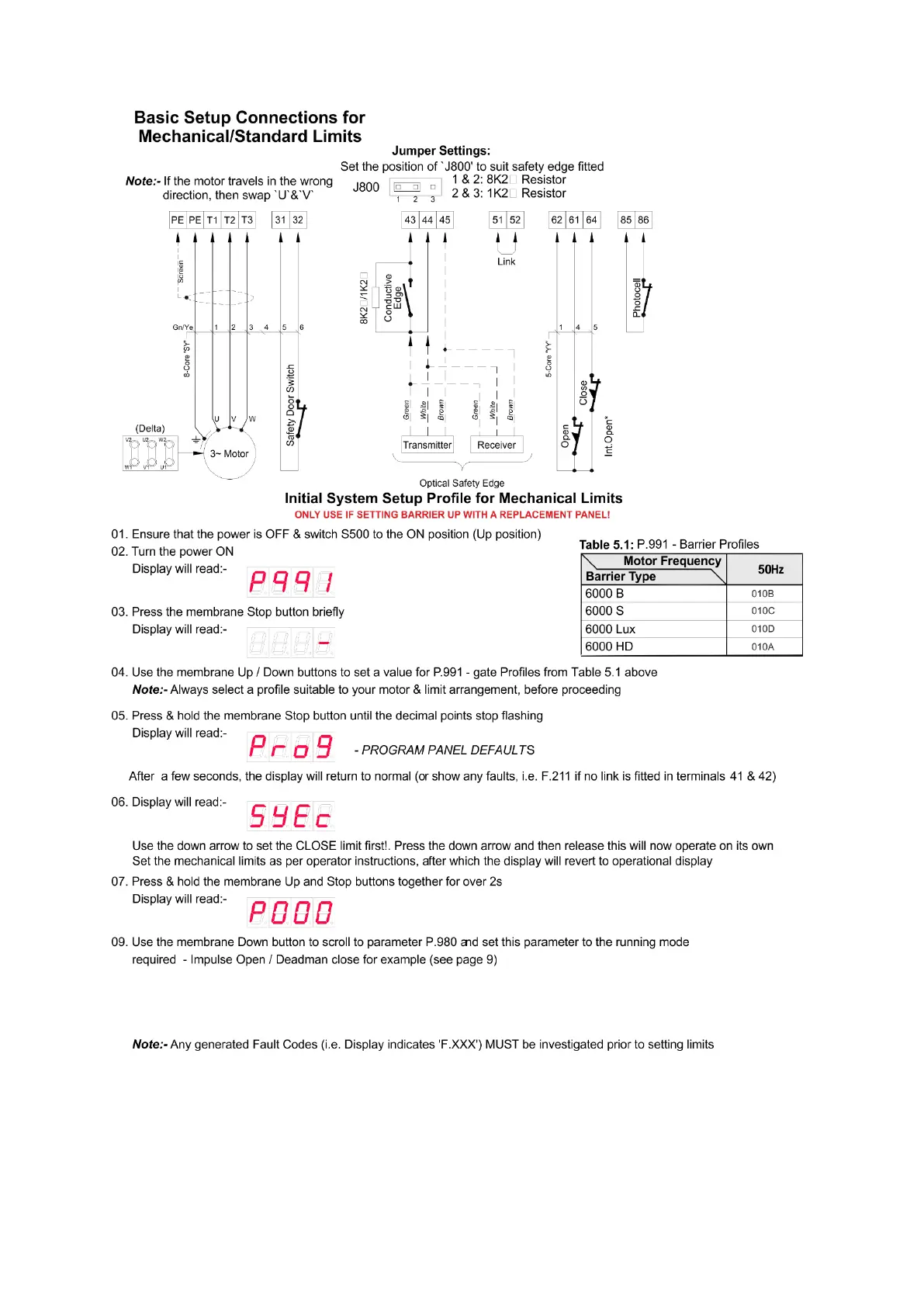 Parking Facilities PF6000 - Basic Setup Connections and Initial Configuration; Mechanical Limit Switch Wiring Options; Jumper Settings and Safety Edge Configuration; Initial System Setup Profile Configuration
