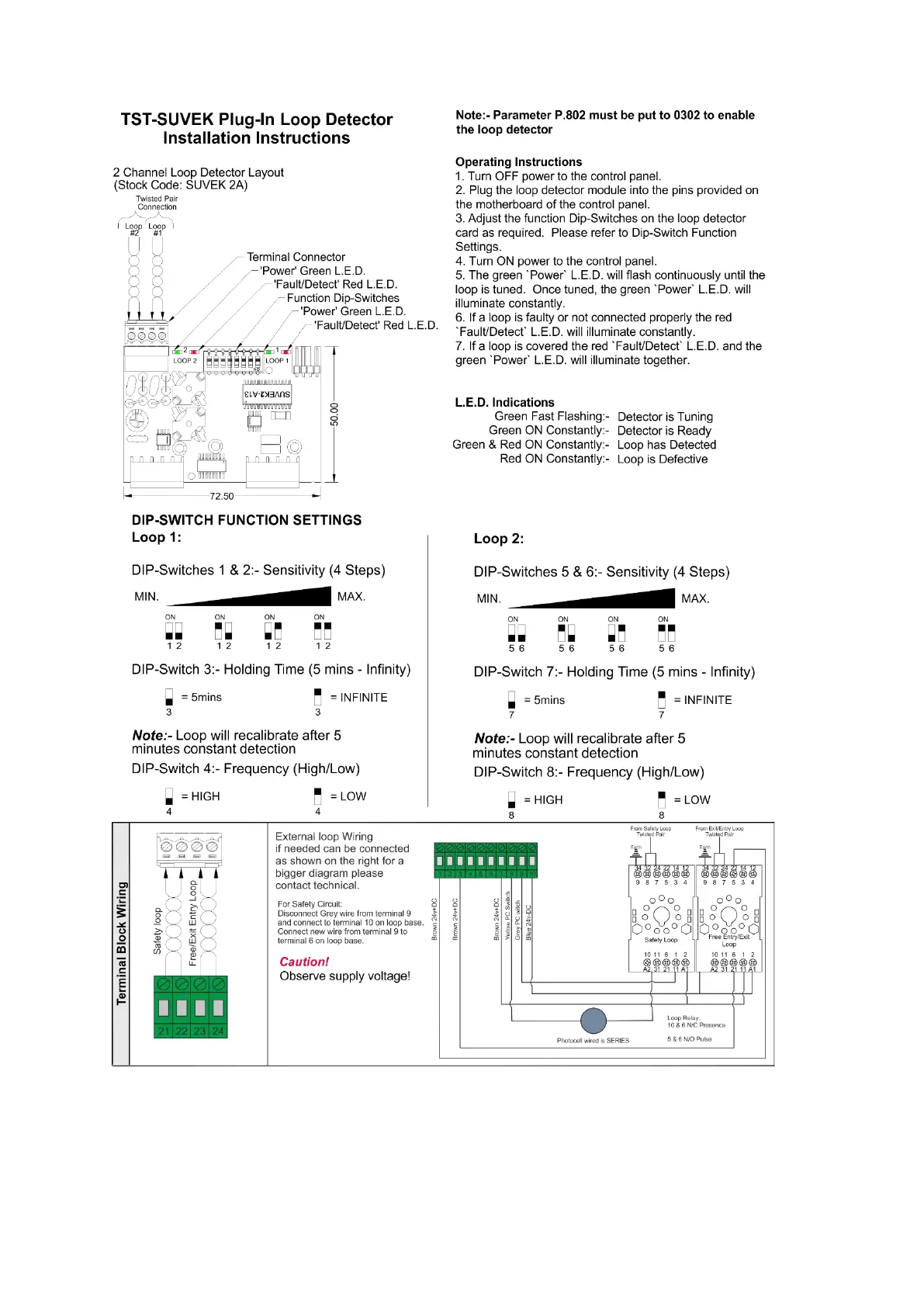 Parking Facilities PF6000 - TST-SUVEK Plug-In Loop Detector Installation; Loop Detector Installation and Operation; DIP-Switch Settings and LED Indications; Loop Detector Terminal Block Wiring