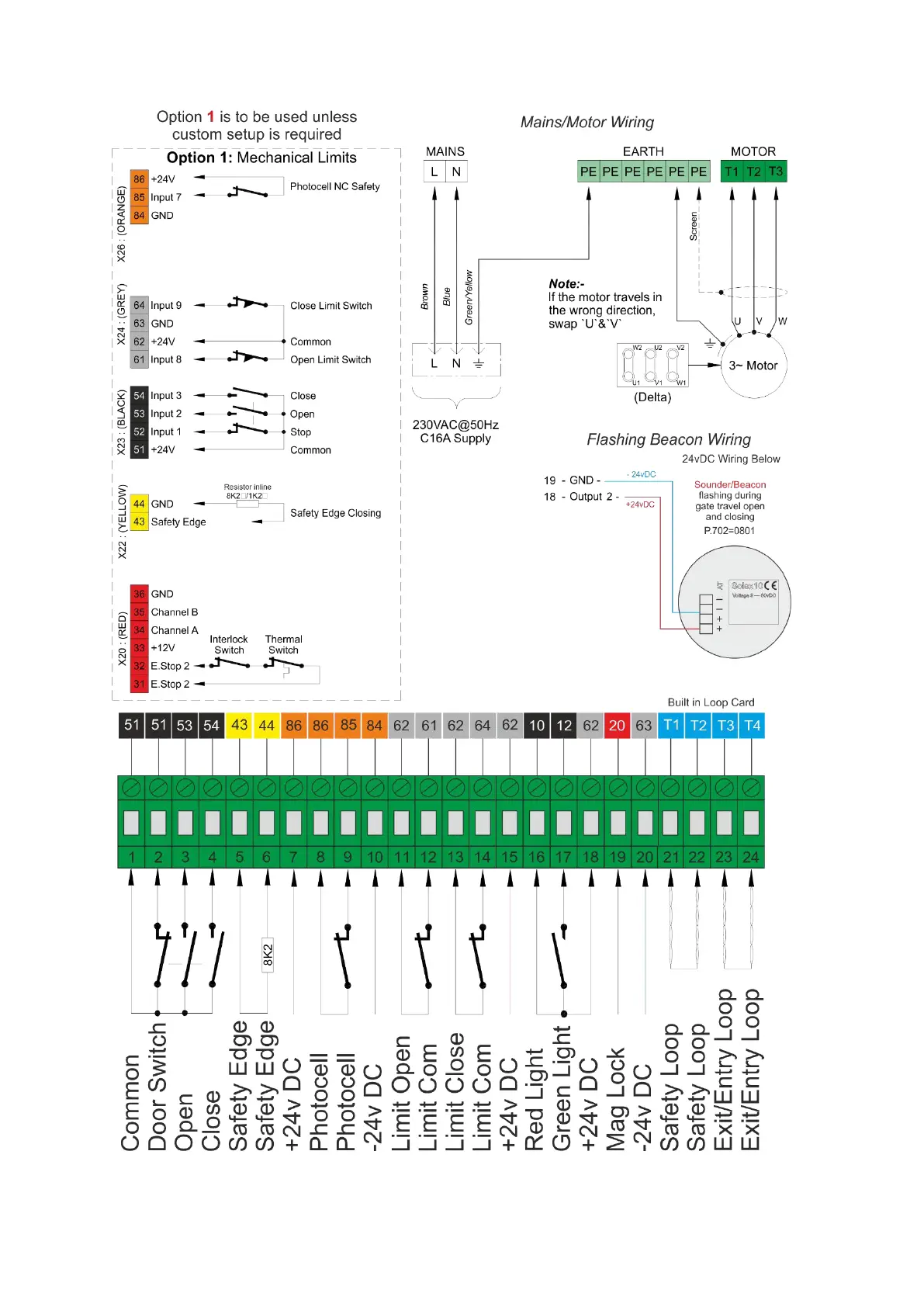 Parking Facilities PF6000 - Electrical Connections and Wiring Diagrams; Mechanical Limit Switch Wiring Options; Mains, Motor, and Beacon Wiring Diagrams; Built-in Loop Card Connection Details