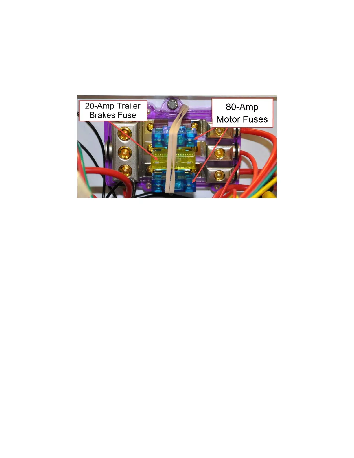 The Fuse Block holds the fuses for the main wheel motors (80-Amp) and the