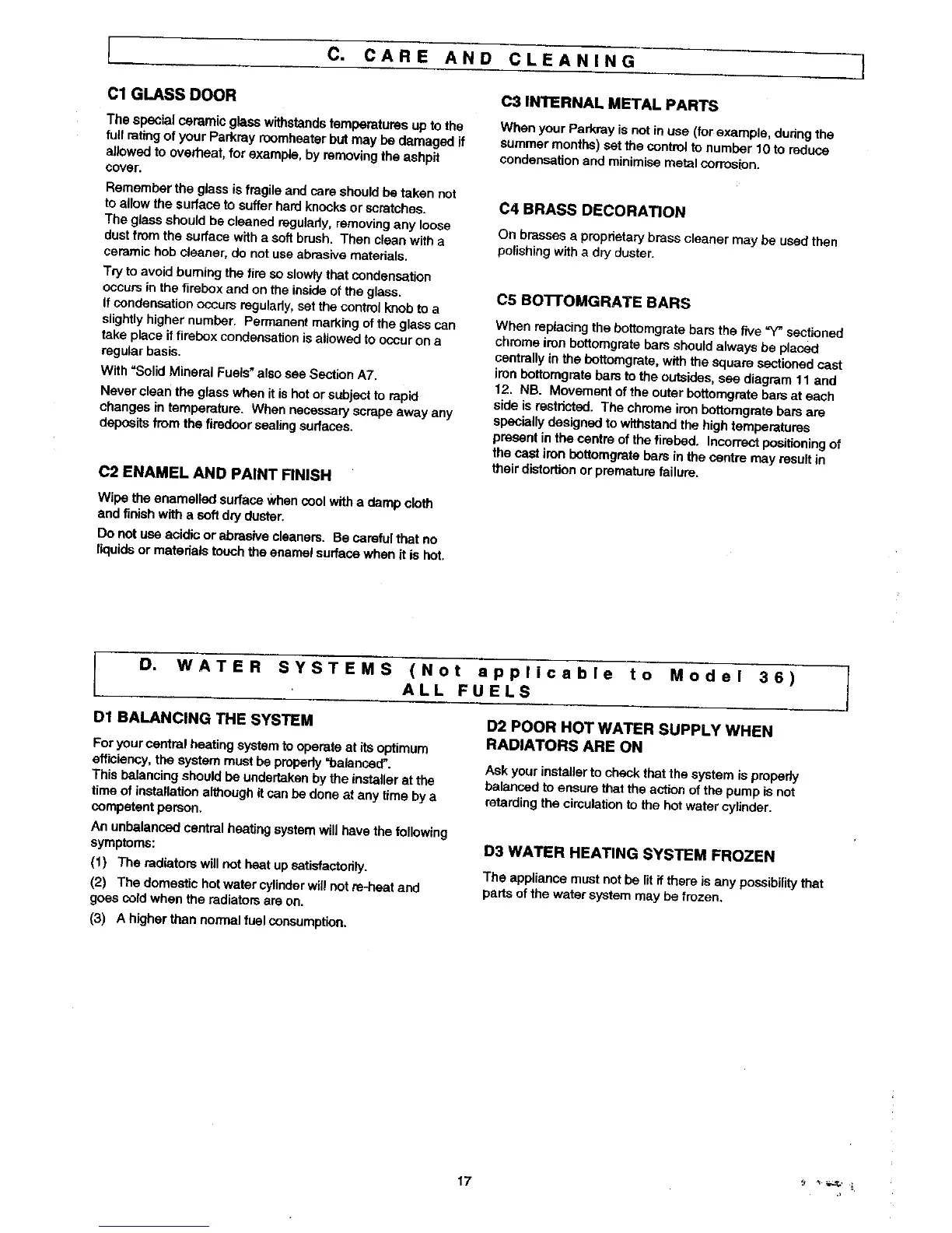 Parkray Chiltern - Care and Cleaning; C1 Glass Door; C2 Enamel and Paint Finish; C3 Internal Metal Parts