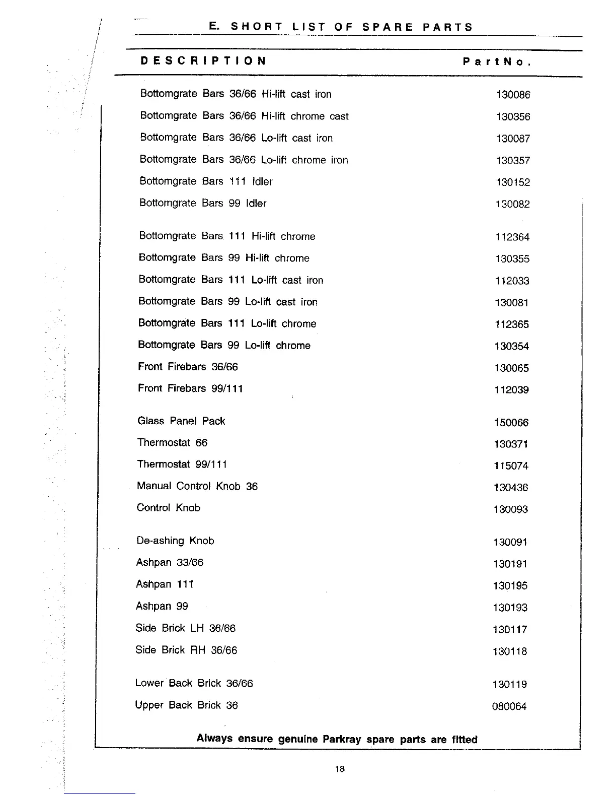 Parkray Chiltern - Short List of Spare Parts; Spare Parts List